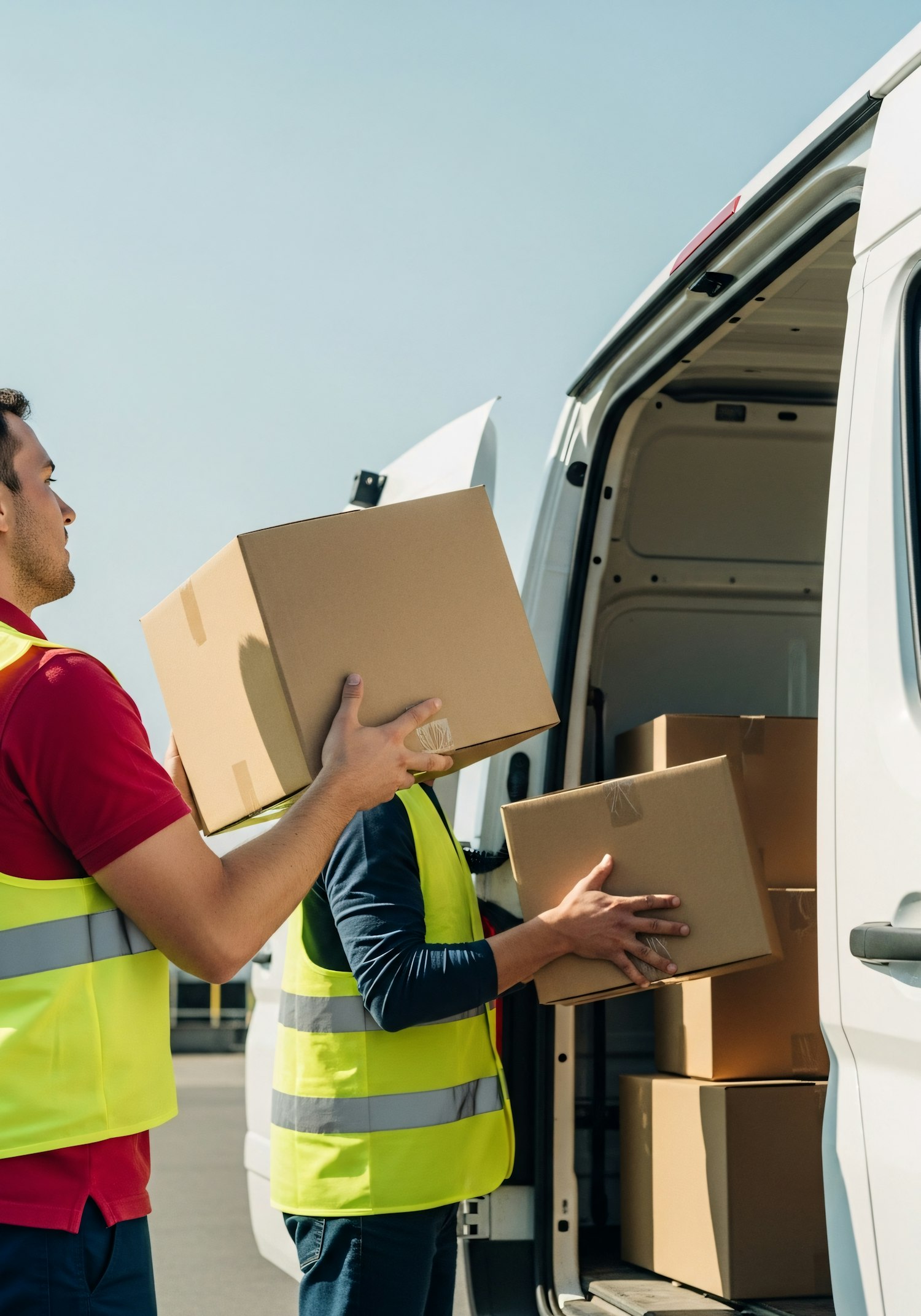 Two workers in high-visibility vests load cardboard boxes into a white delivery van under a clear blue sky.
