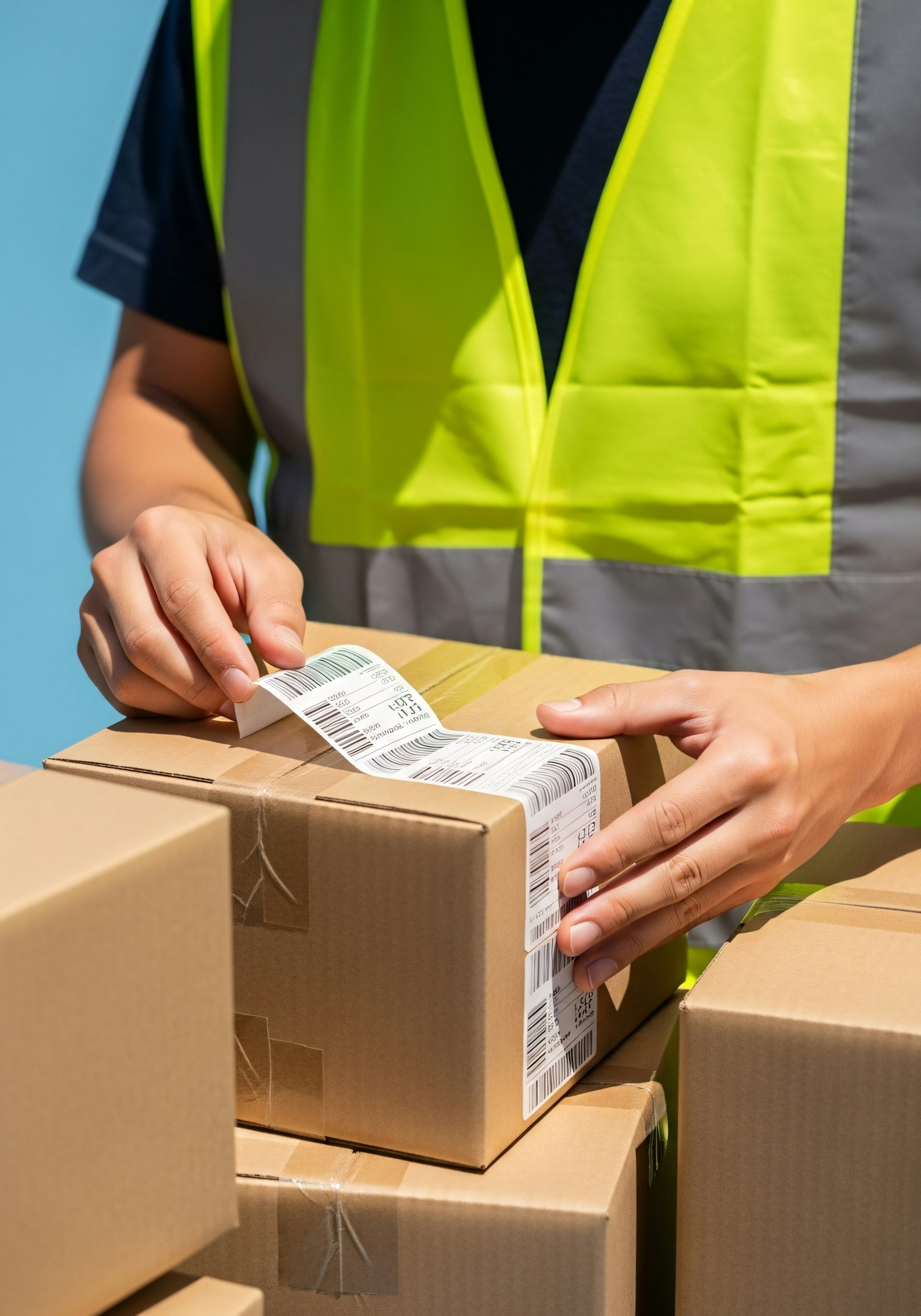 A worker in a safety vest applies a shipping label to a cardboard box, set against a clean blue background, highlighting logistics work.