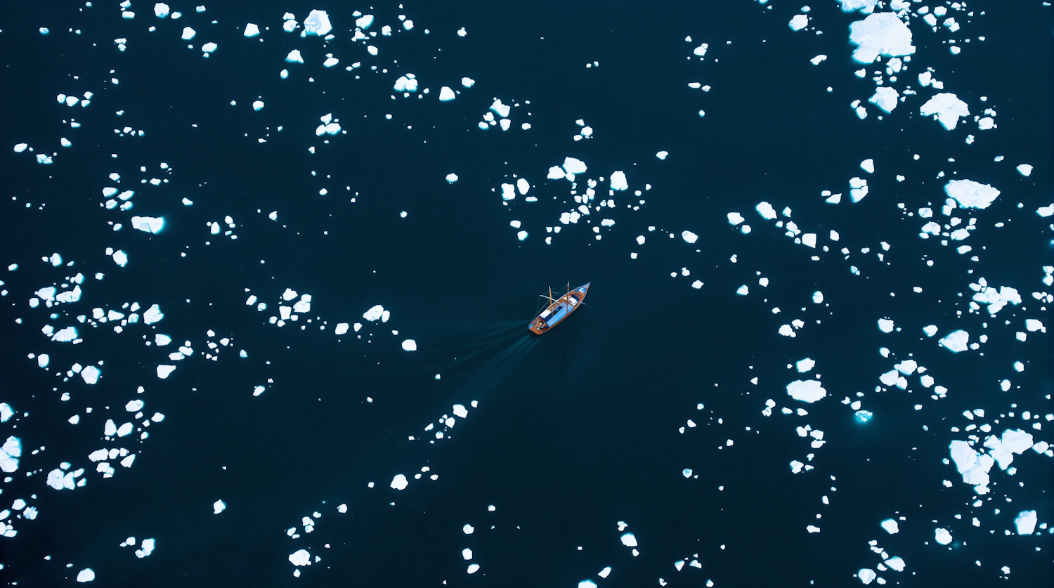 Aerial view of a wooden boat navigating through icy waters, surrounded by scattered white icebergs on a deep blue sea.
