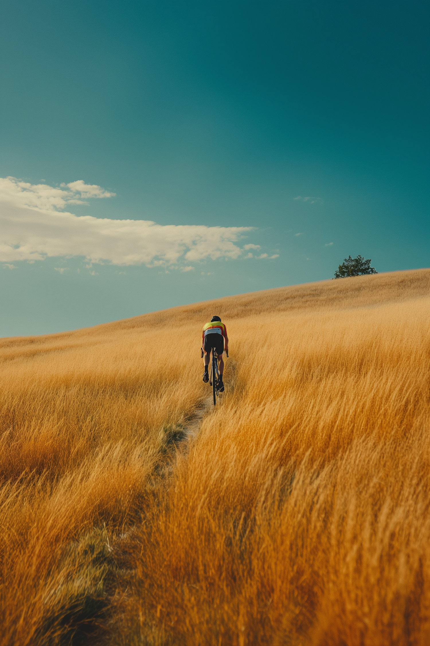 Cyclist rides through golden grass field under a deep blue sky, creating a serene and adventurous scene with vibrant colors.
