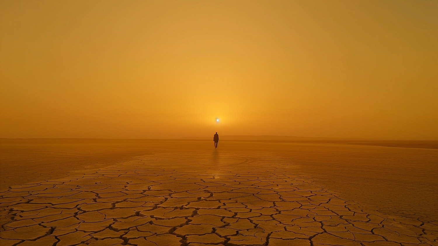 A lone figure walks across a cracked desert at sunset, surrounded by a golden-orange sky and an endless, barren horizon.