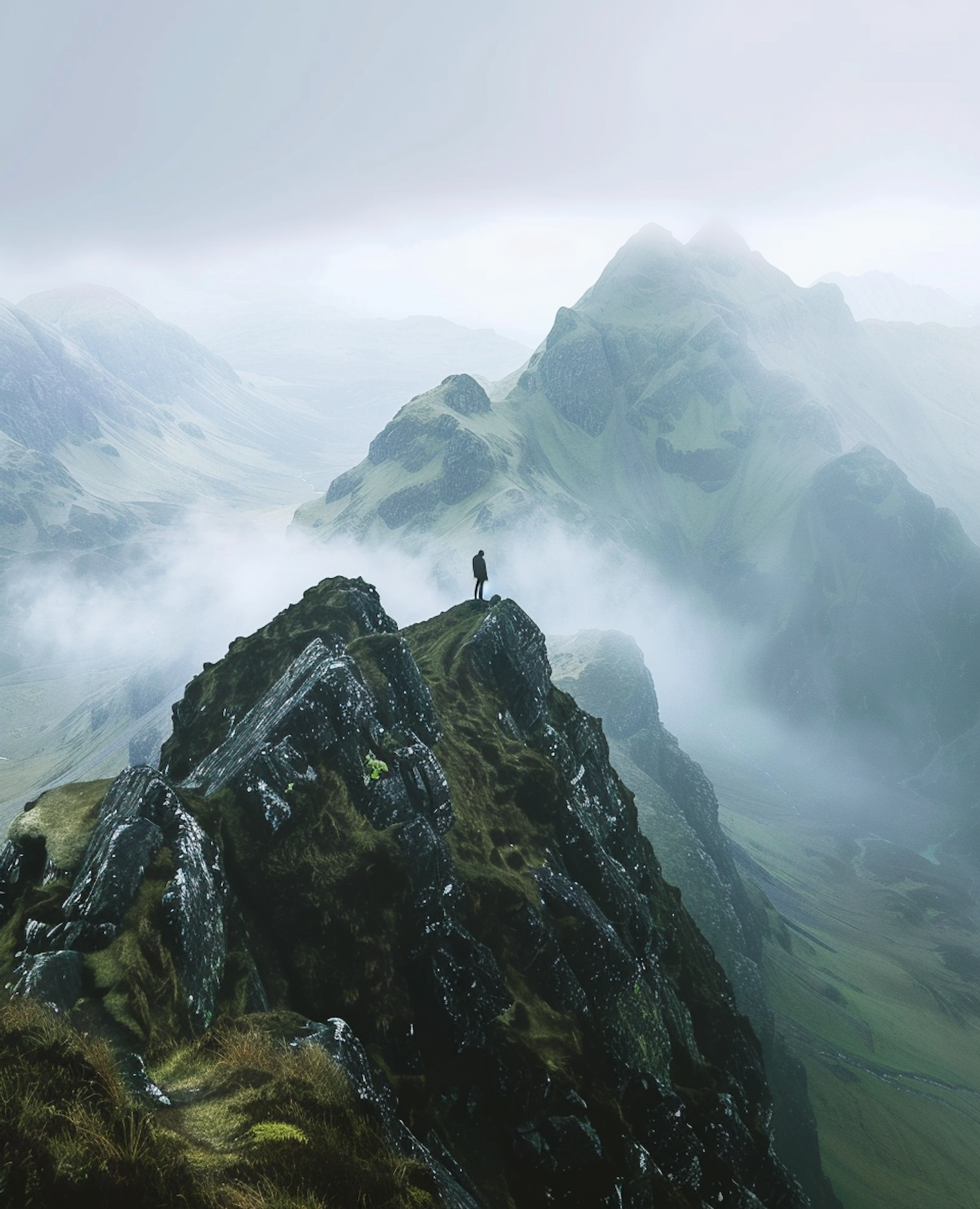 A lone figure stands on a misty mountain peak, surrounded by dramatic, cloud-covered landscapes, evoking a sense of adventure and solitude.