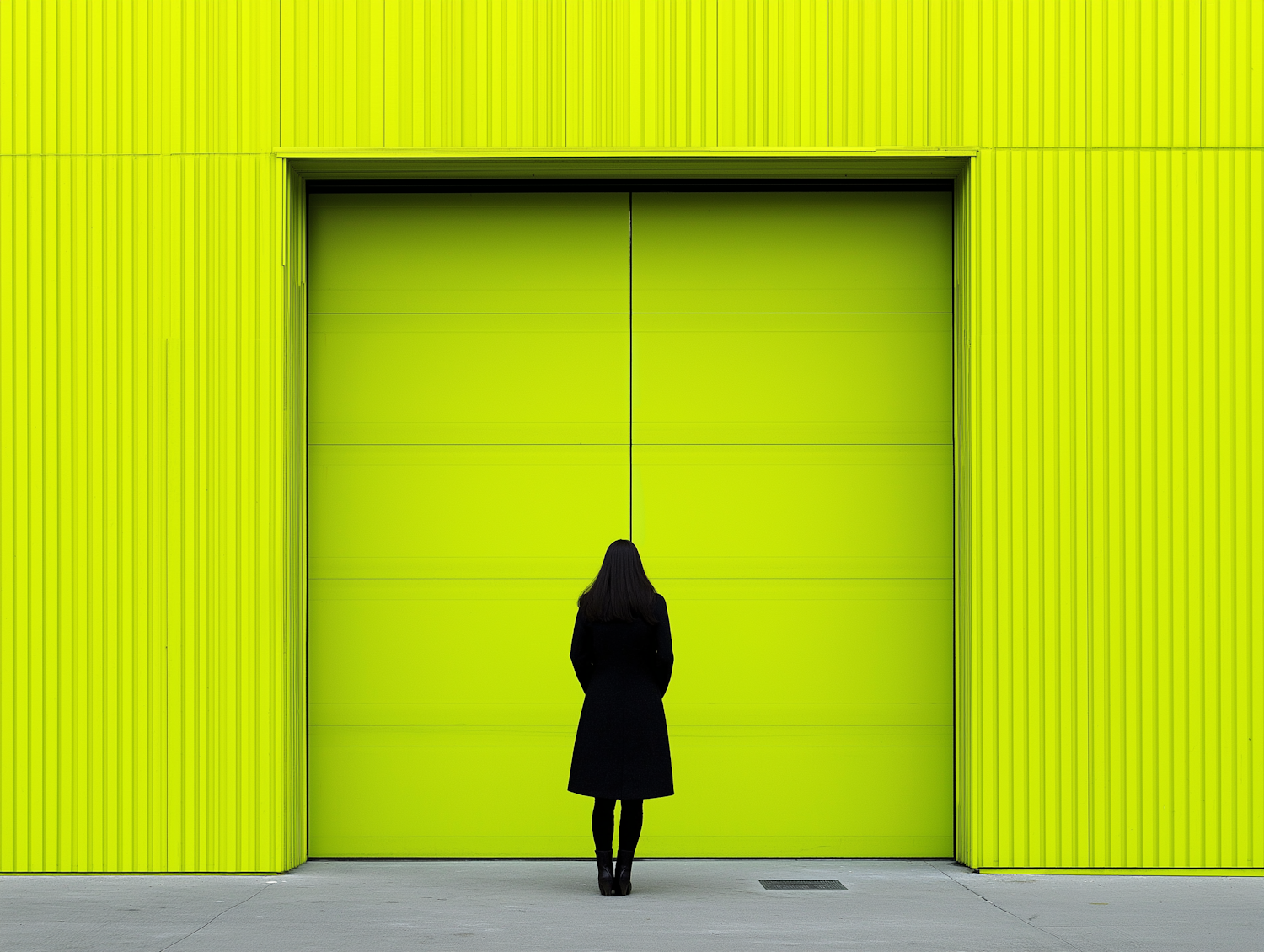 Person in black coat stands before a vibrant lime green door, creating a striking contrast. Minimalistic and bold visual composition.