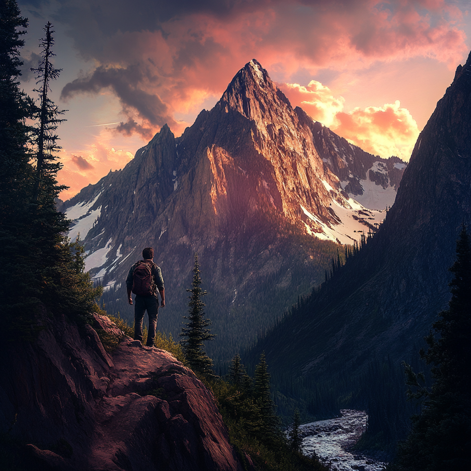Hiker on a rocky outcrop gazes at a majestic mountain during sunset, surrounded by vibrant skies and lush evergreens.