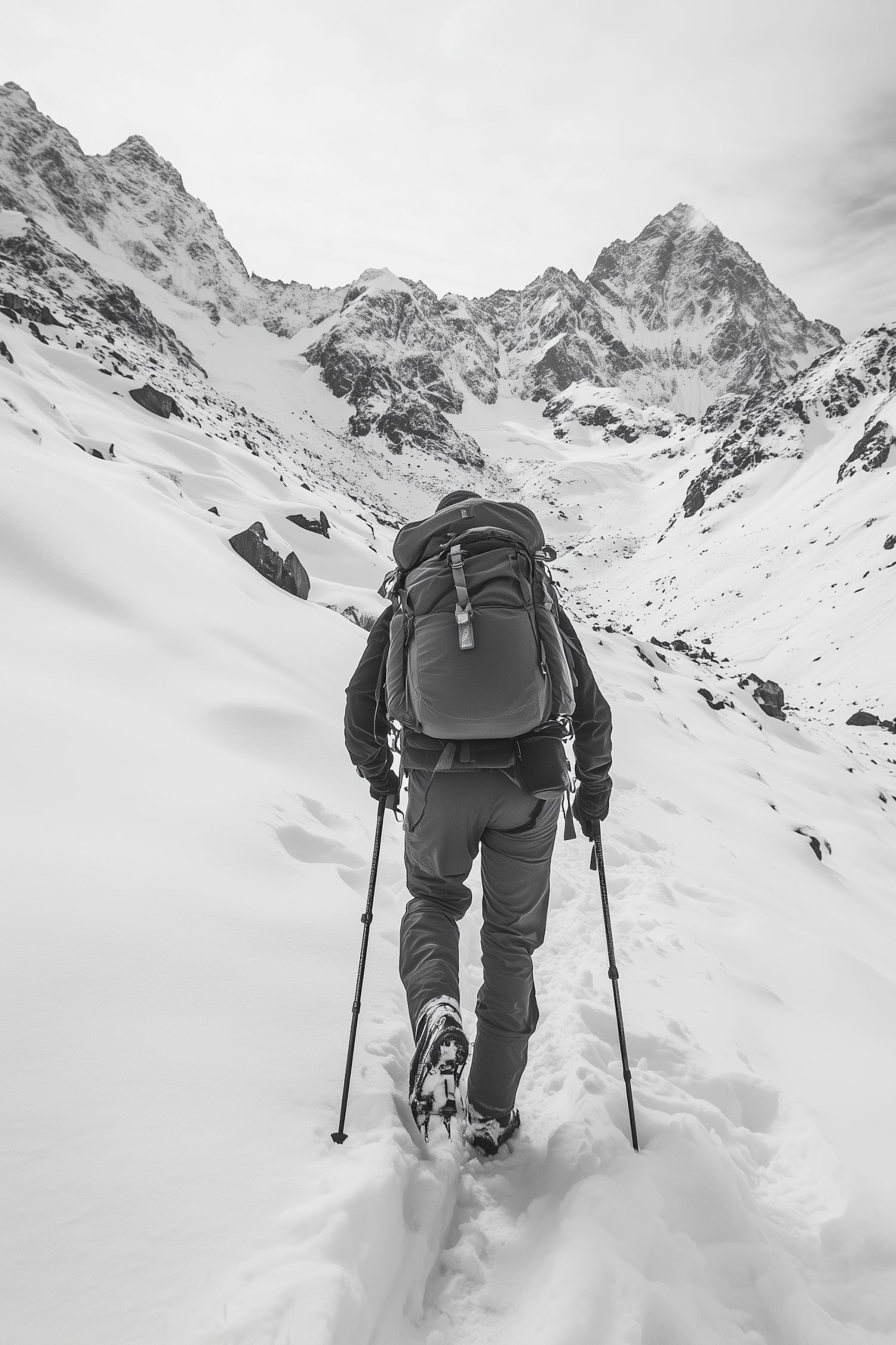 A lone hiker ascends a snowy mountain trail with trekking poles, surrounded by rugged peaks and a serene winter landscape.