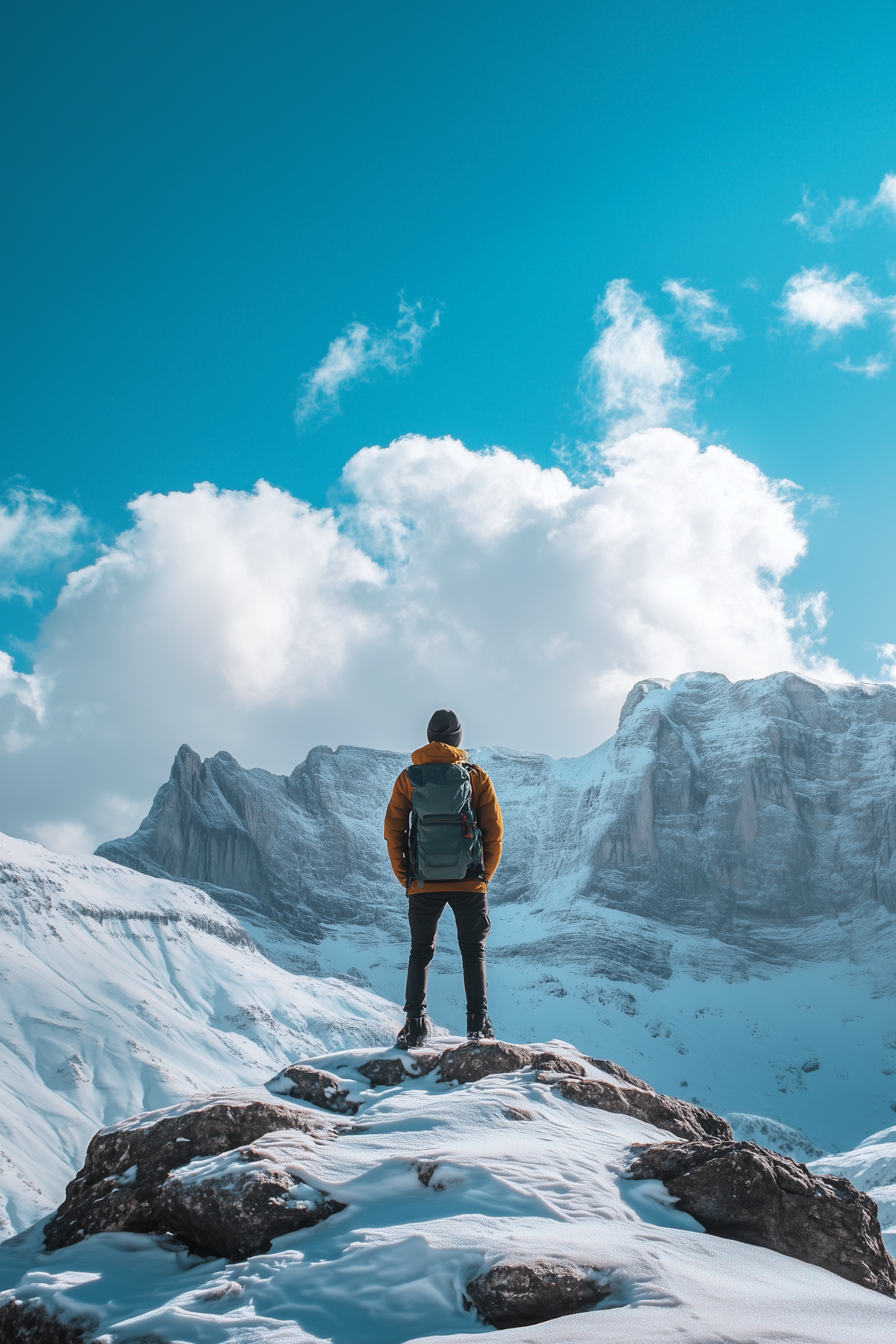 Hiker in a yellow jacket with a backpack stands on snowy rocks, admiring a stunning mountain range under a bright blue sky.