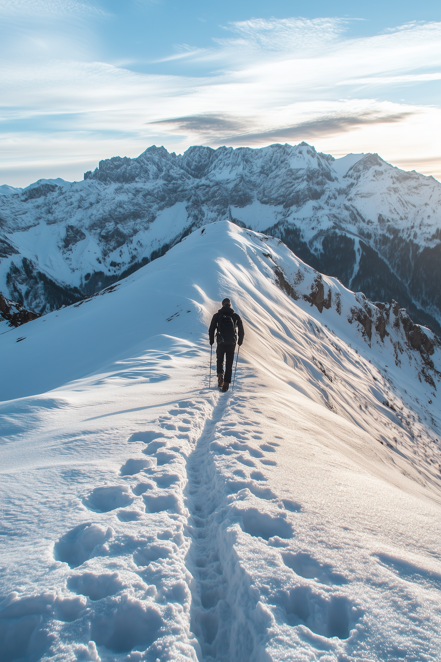 A hiker treks along a snowy mountain ridge with stunning snow-capped peaks in the background, under a sky filled with wispy clouds.