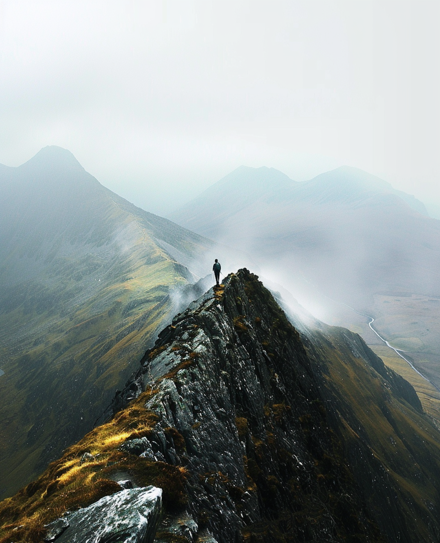 A lone hiker stands on a misty mountain ridge, surrounded by rugged peaks and clouds, capturing a sense of solitude and adventure.