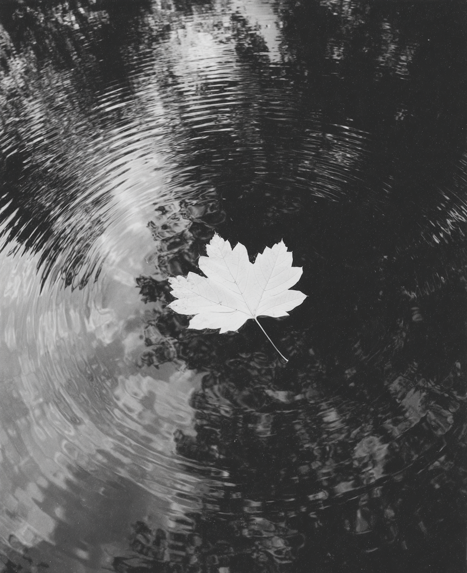 A striking black and white image showcasing a single bright maple leaf on water with a rippling reflection effect.