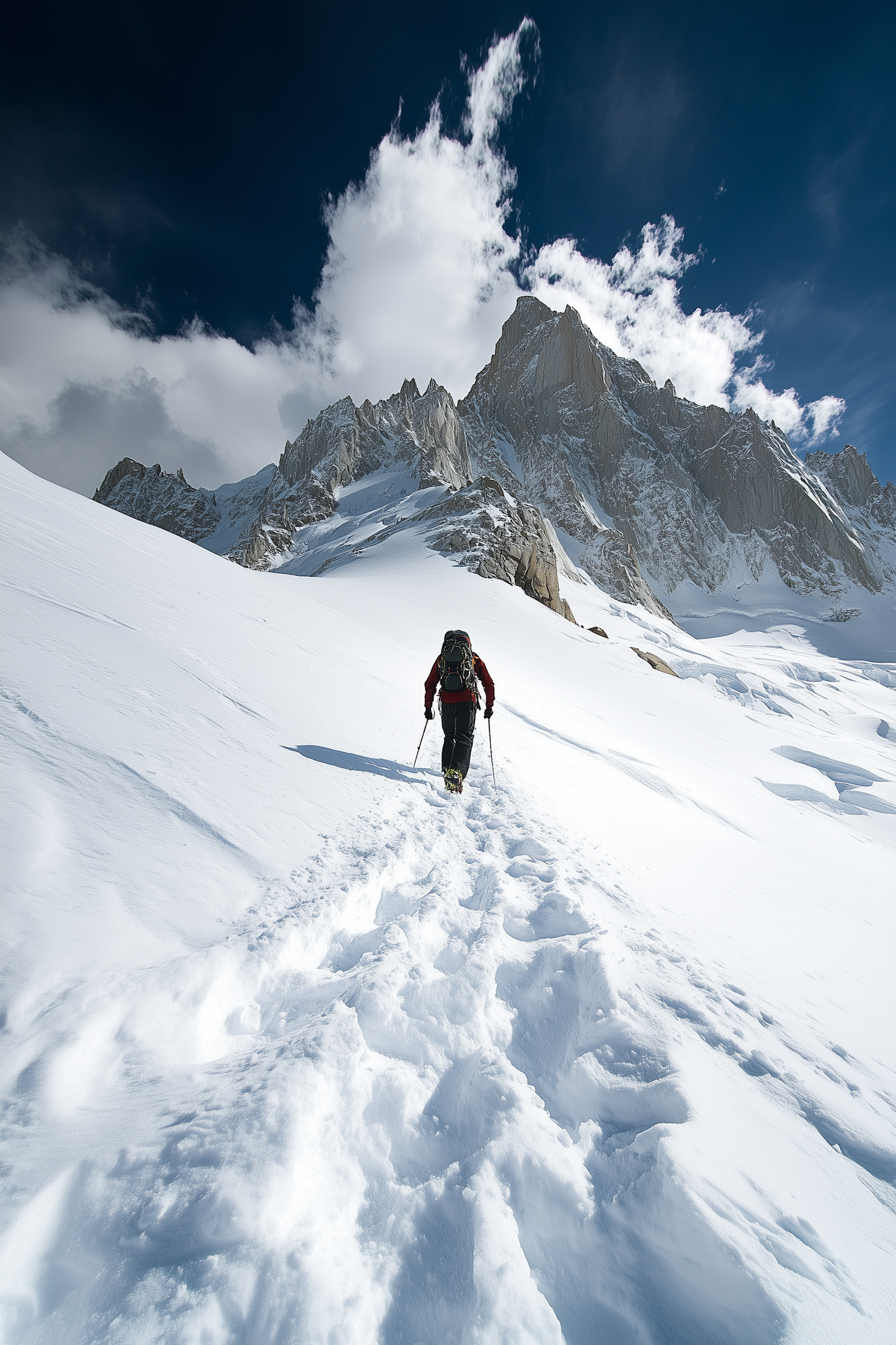 Mountaineer in red jacket climbs snowy slope with trekking poles, dramatic mountain peaks and blue sky in the background.