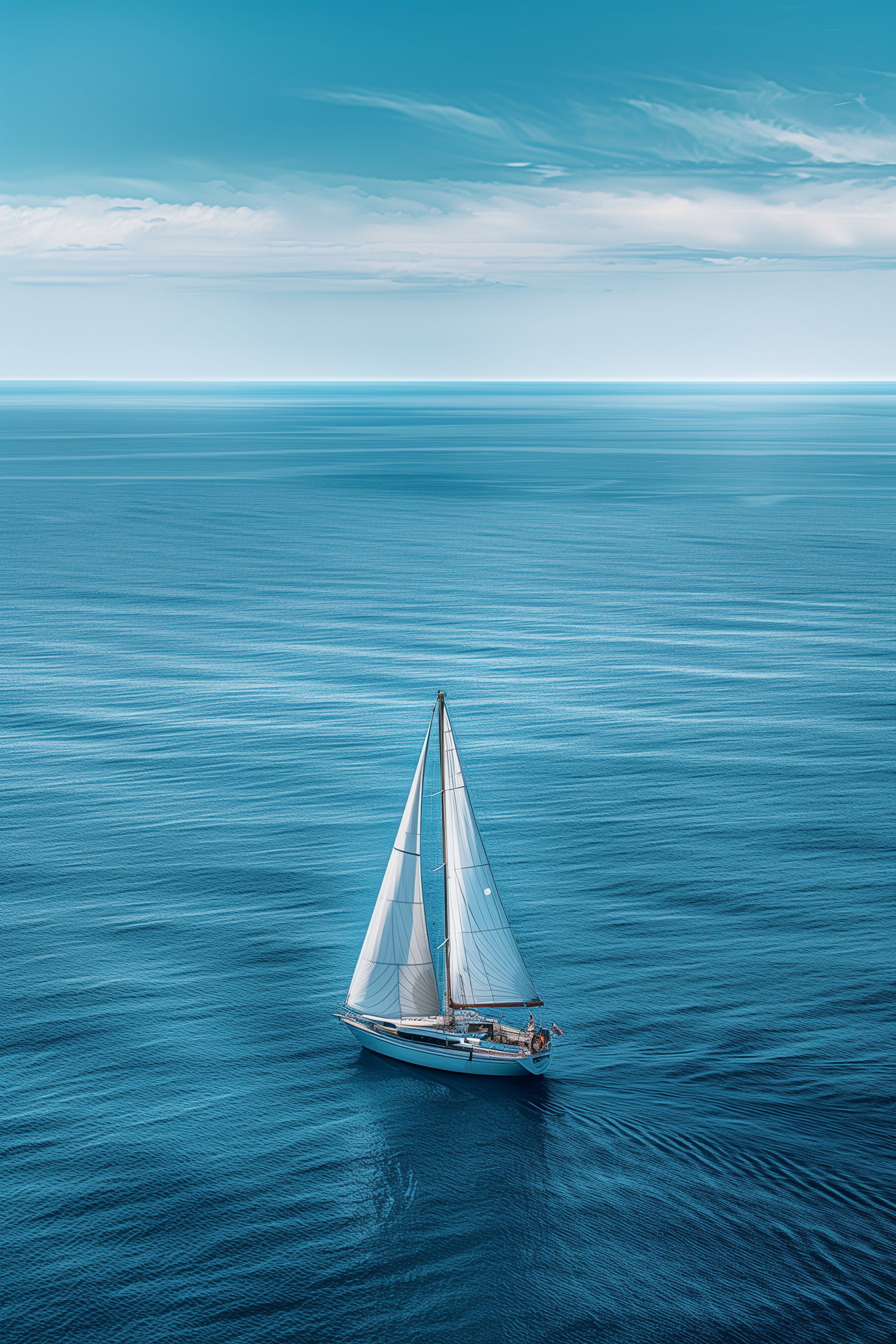 A sailboat with white sails glides on a calm, blue ocean under a clear sky, evoking tranquility and freedom.