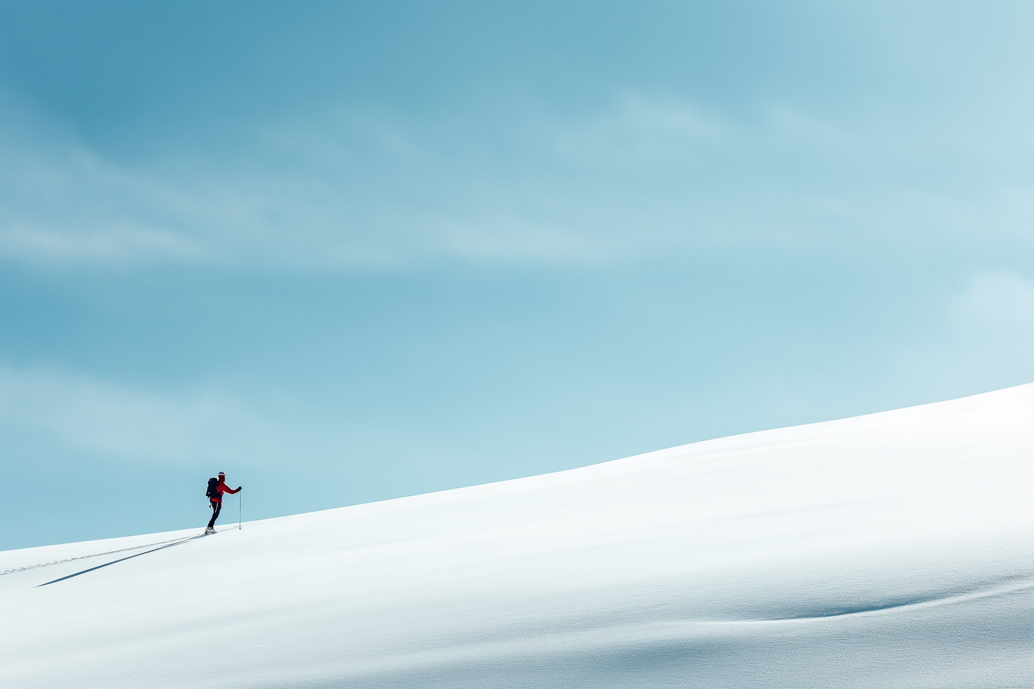Lone skier in red ascends a snowy slope under a vast blue sky, capturing solitude and adventure in a serene winter landscape.