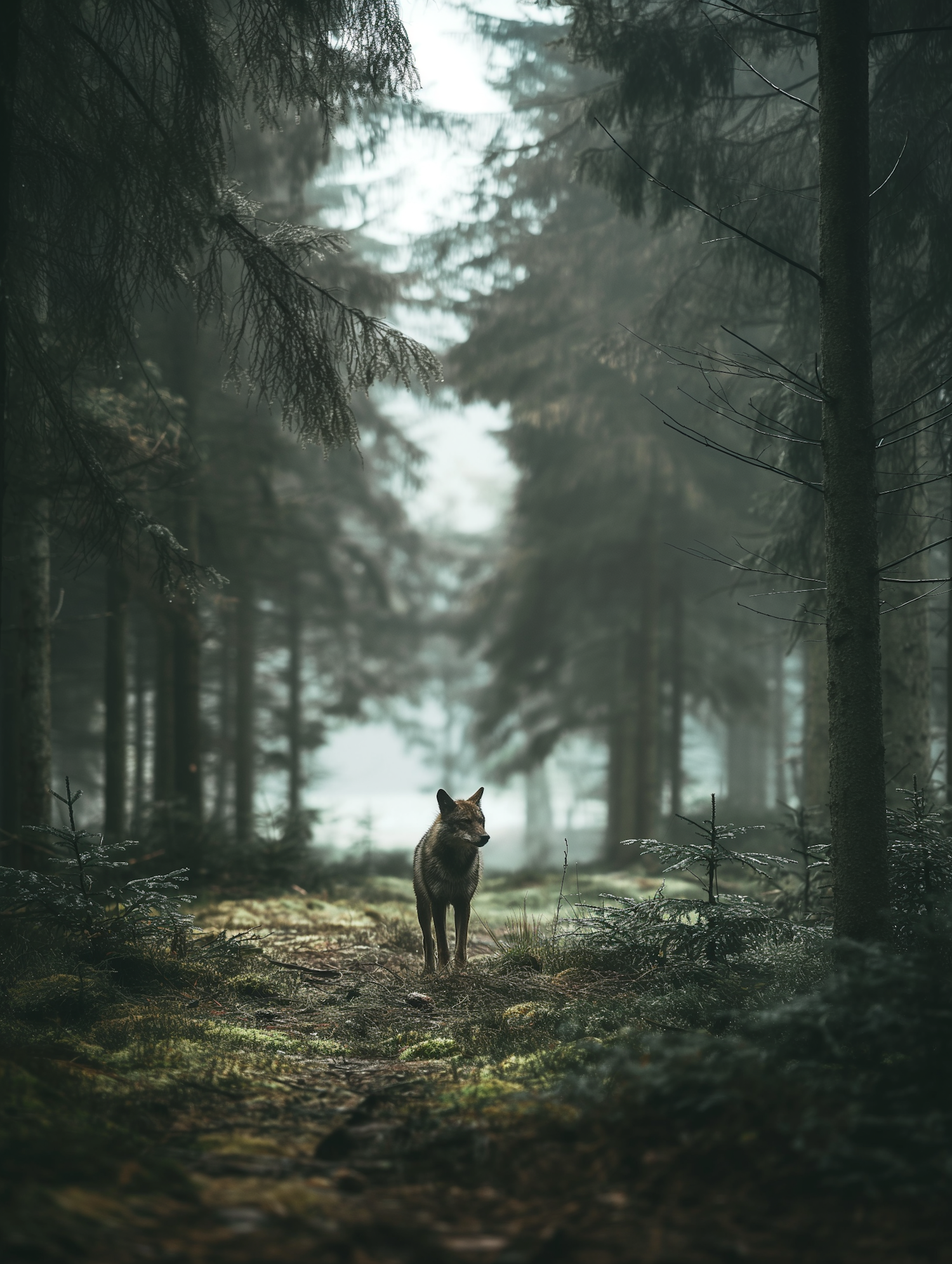 A lone wolf stands in a misty forest, surrounded by tall evergreens and a lush, green forest floor.