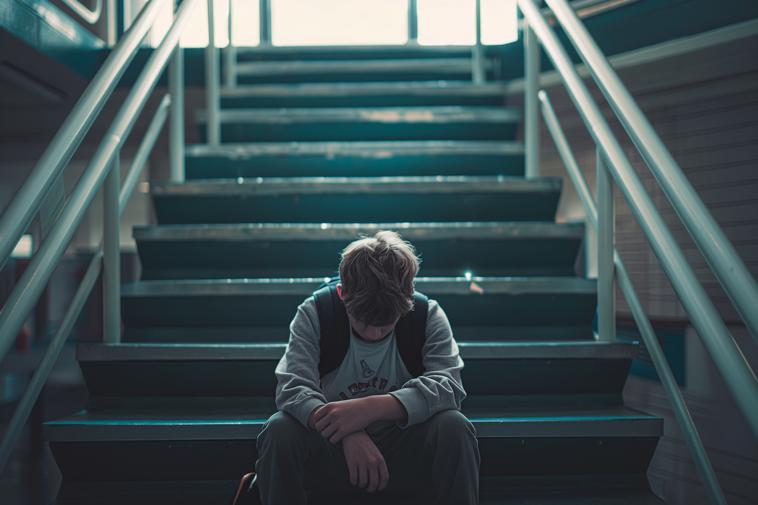 A young boy sits on a staircase, head bowed, conveying a sense of contemplation or sadness. Soft lighting highlights the teal steps.