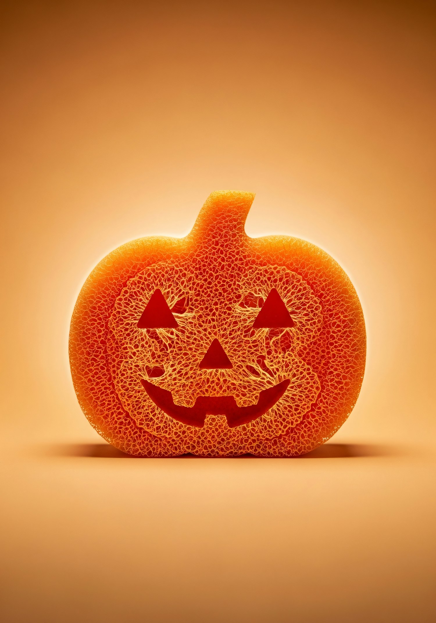 A loofah sponge shaped like a jack-o'-lantern glows warmly against an orange background, showcasing its intricate texture.