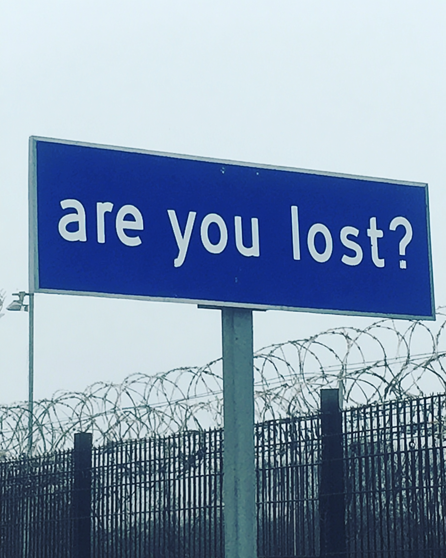 A blue sign reading 'are you lost?' stands in front of a barbed wire fence under an overcast sky, creating a thought-provoking scene.