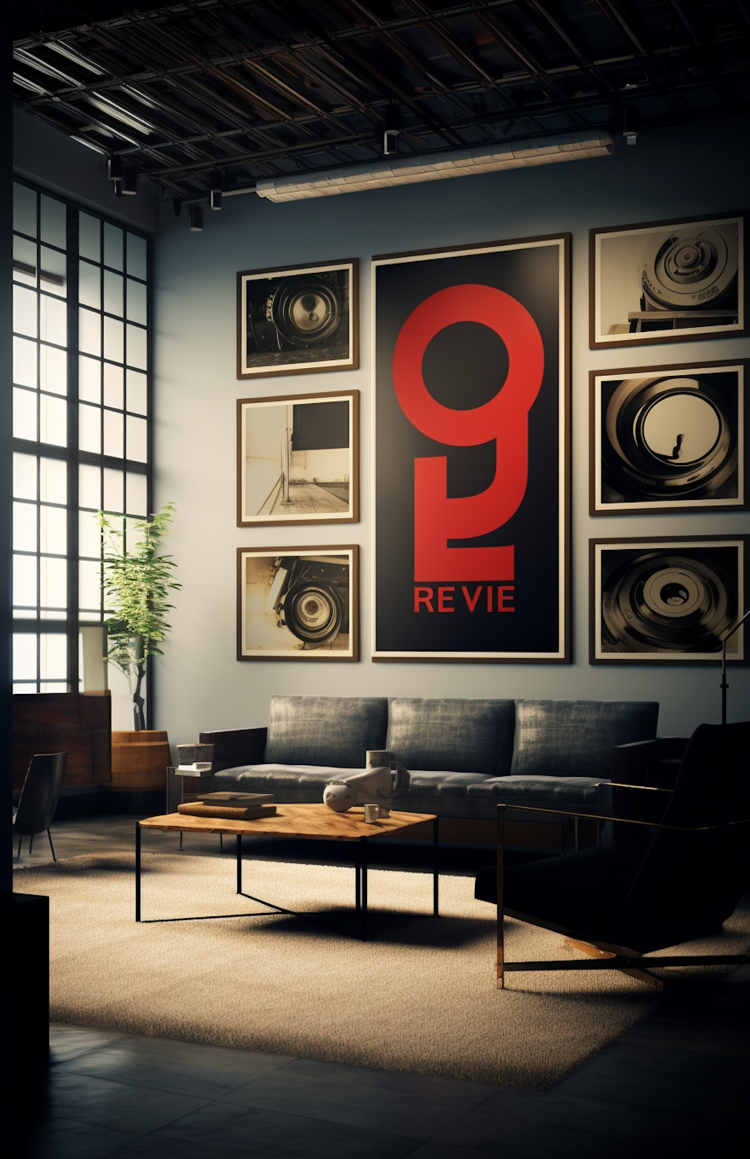 Modern living room with minimalist decor, featuring a gray sofa, artistic wall frames, and large windows for natural light.