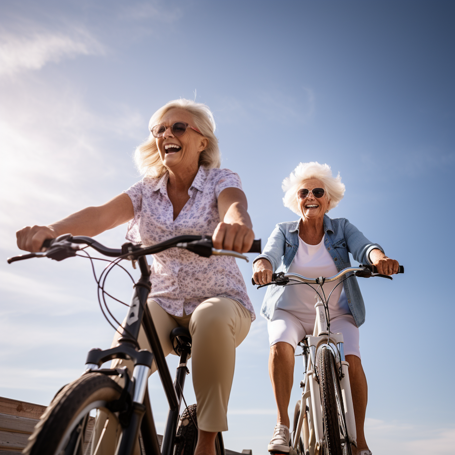Two elderly women joyfully ride bicycles under a clear blue sky, exuding happiness and freedom in casual attire and sunglasses.