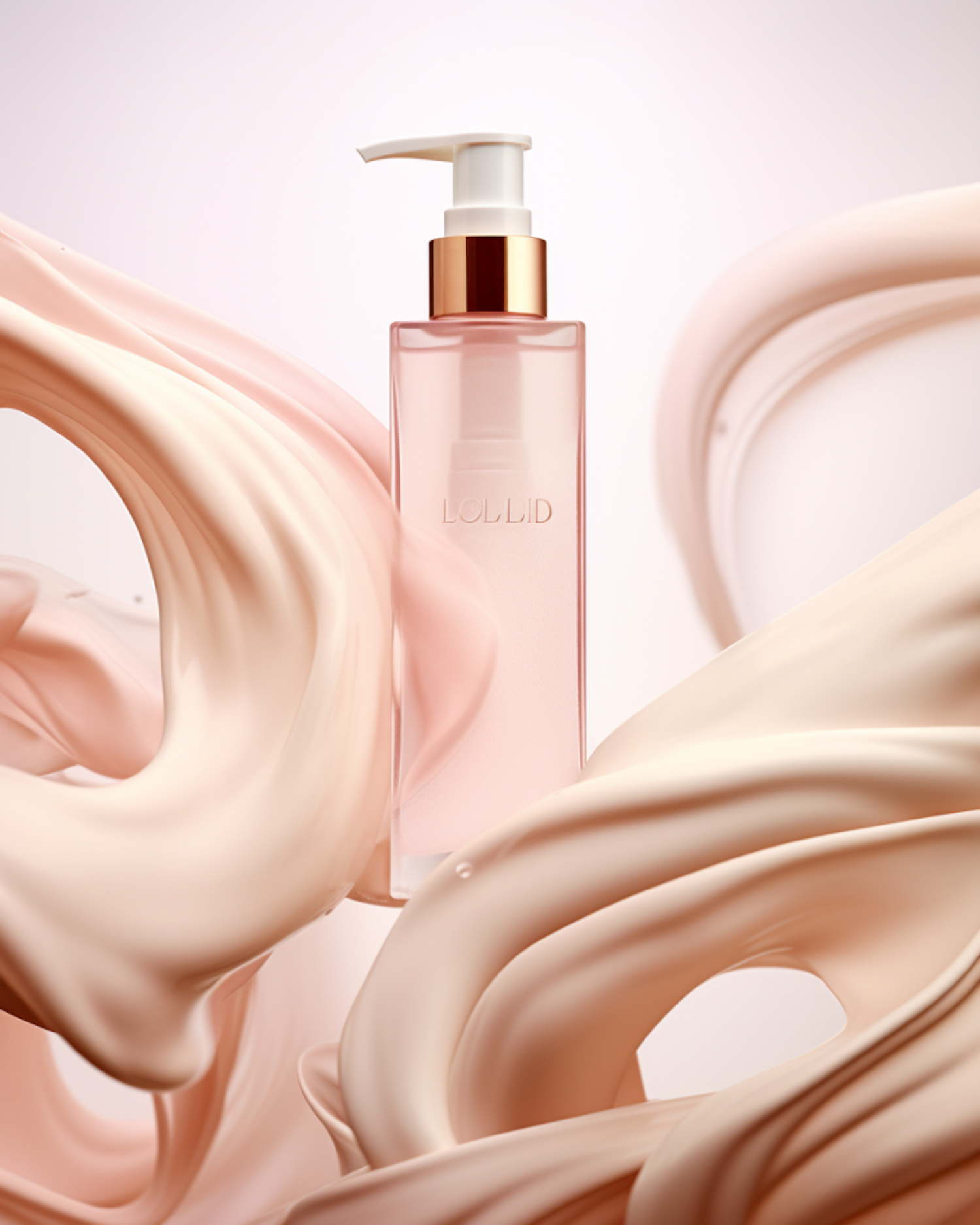 Elegant skincare bottle with gold pump amidst swirling creamy textures, exuding luxury and sophistication.