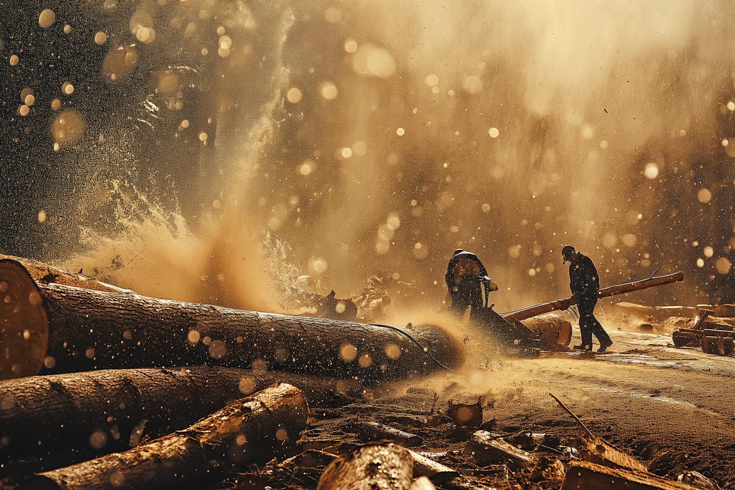 Dramatic logging scene with two workers, chainsaw, and flying sawdust in warm golden light. Intense and dynamic atmosphere.