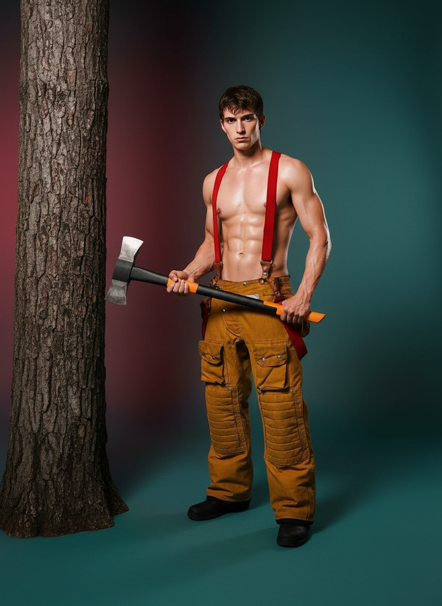 A muscular man in work pants and suspenders holds an axe beside a tree, set against a dramatic green and red gradient background.