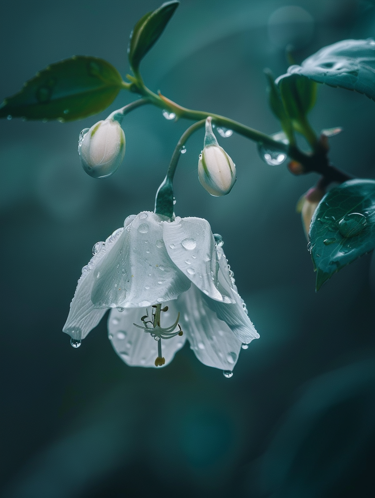 Close-up of a white bell-shaped flower with water droplets, surrounded by buds and green leaves against a blurred teal background.