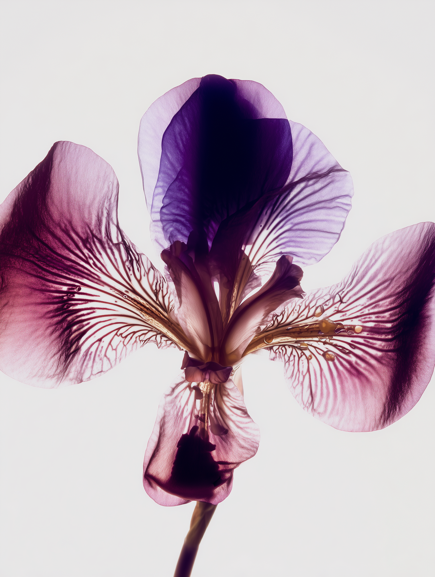 A stunning close-up of a translucent purple and pink flower, showcasing its intricate veining and luminous petals against a white background.
