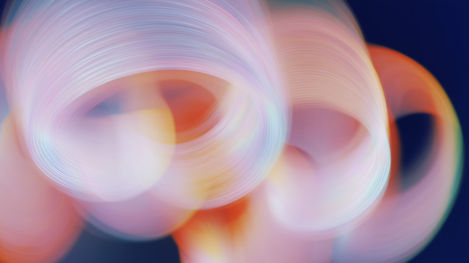 Abstract swirls of pastel light trails in pink, orange, and blue on a deep navy background, creating a dreamy and fluid visual effect.
