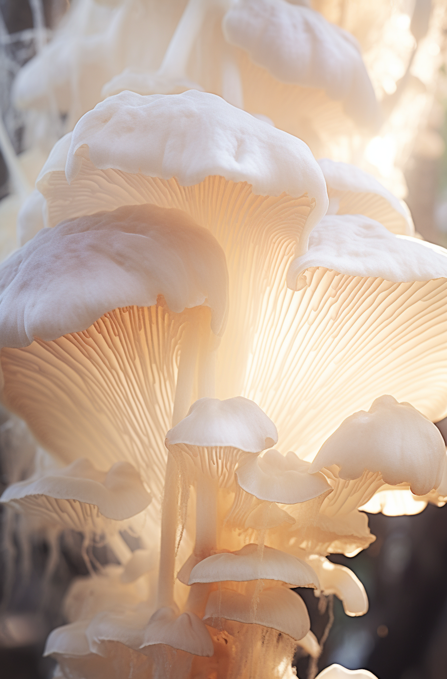 Delicate white mushrooms with intricate gills, softly lit to highlight their translucent beauty and serene natural textures.