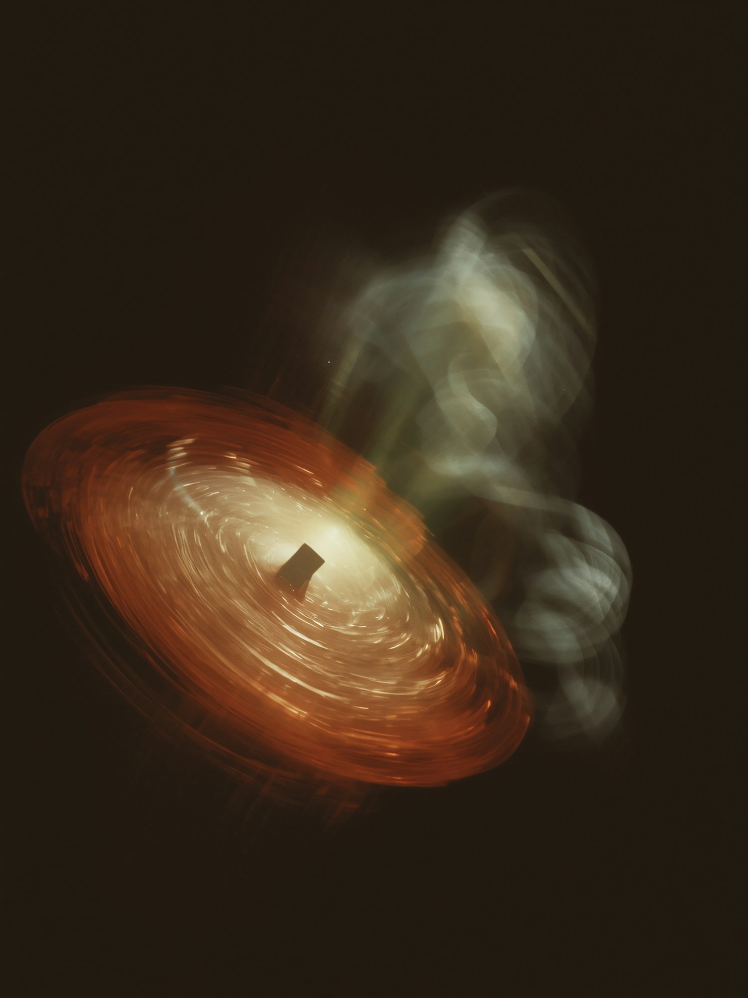 Abstract image of a glowing, spinning object with orange and white light trails against a dark background, evoking motion and energy.