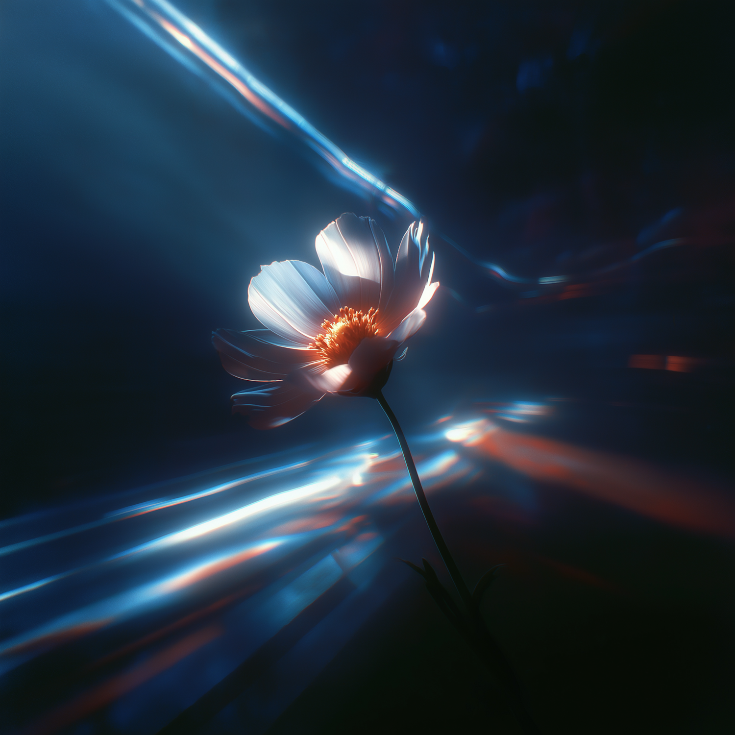 A glowing white flower with warm orange center against a dreamy, dark background with streaks of blue and teal light.