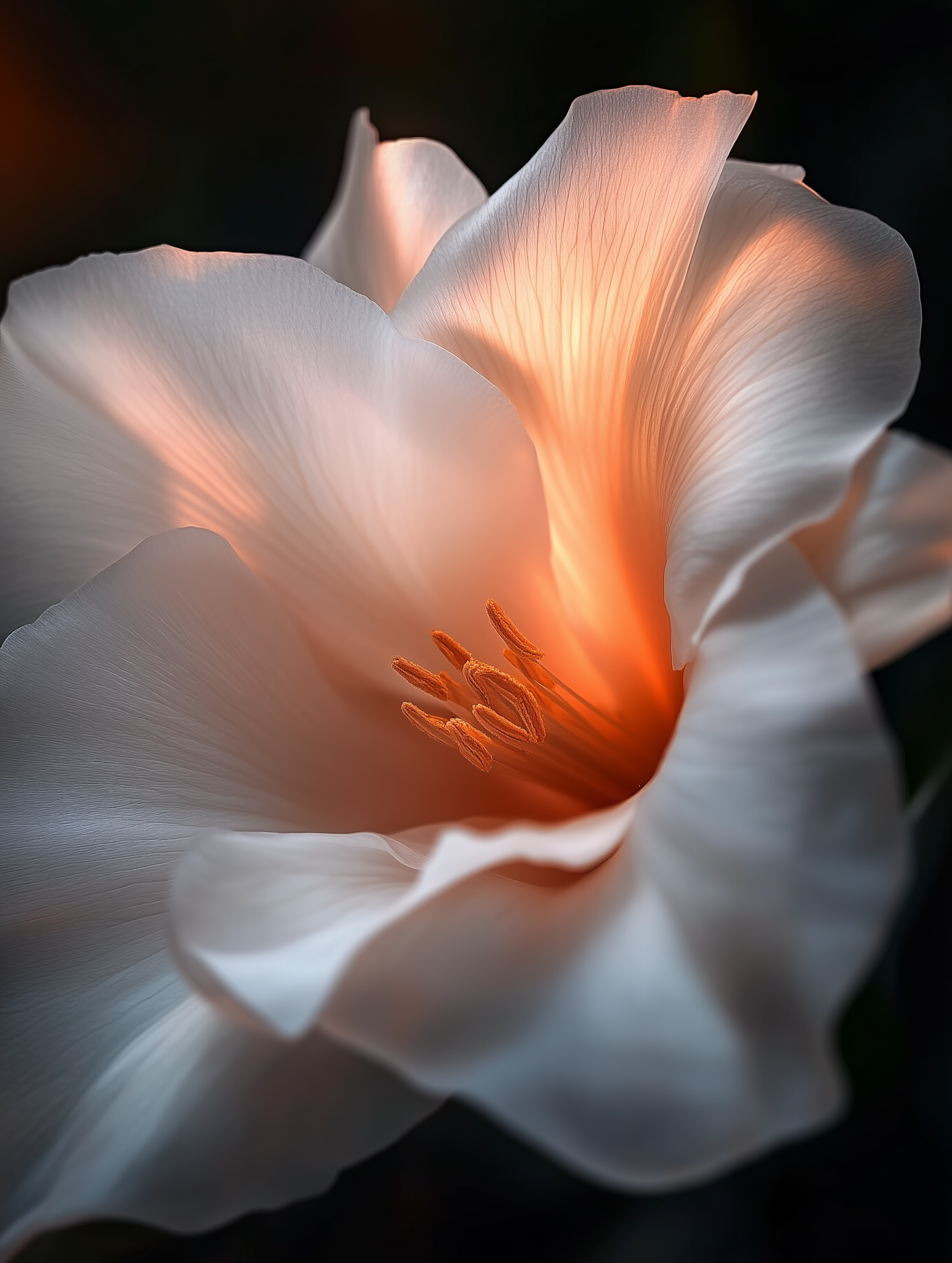 Close-up of a glowing white flower with orange stamens, showcasing delicate textures and a dramatic dark background.