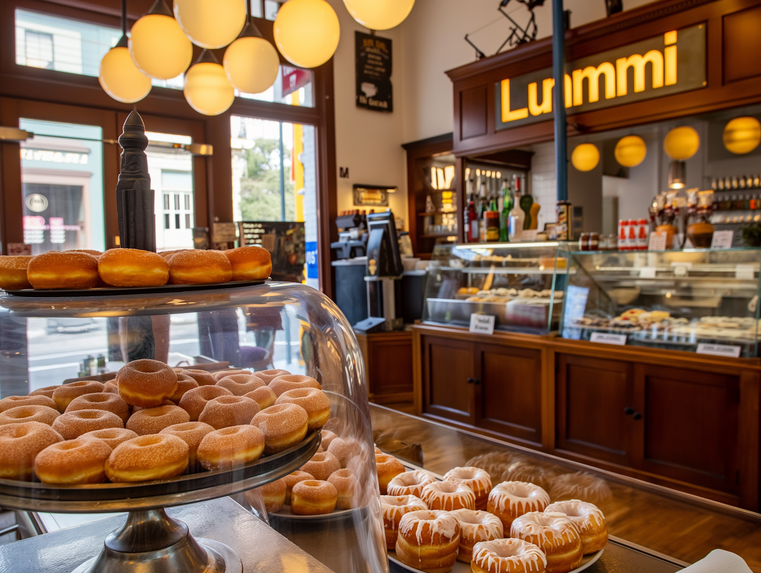 Warm bakery interior with fresh donuts under a glass dome, wooden counters, glowing 'Lummi' sign, and inviting pendant lighting.