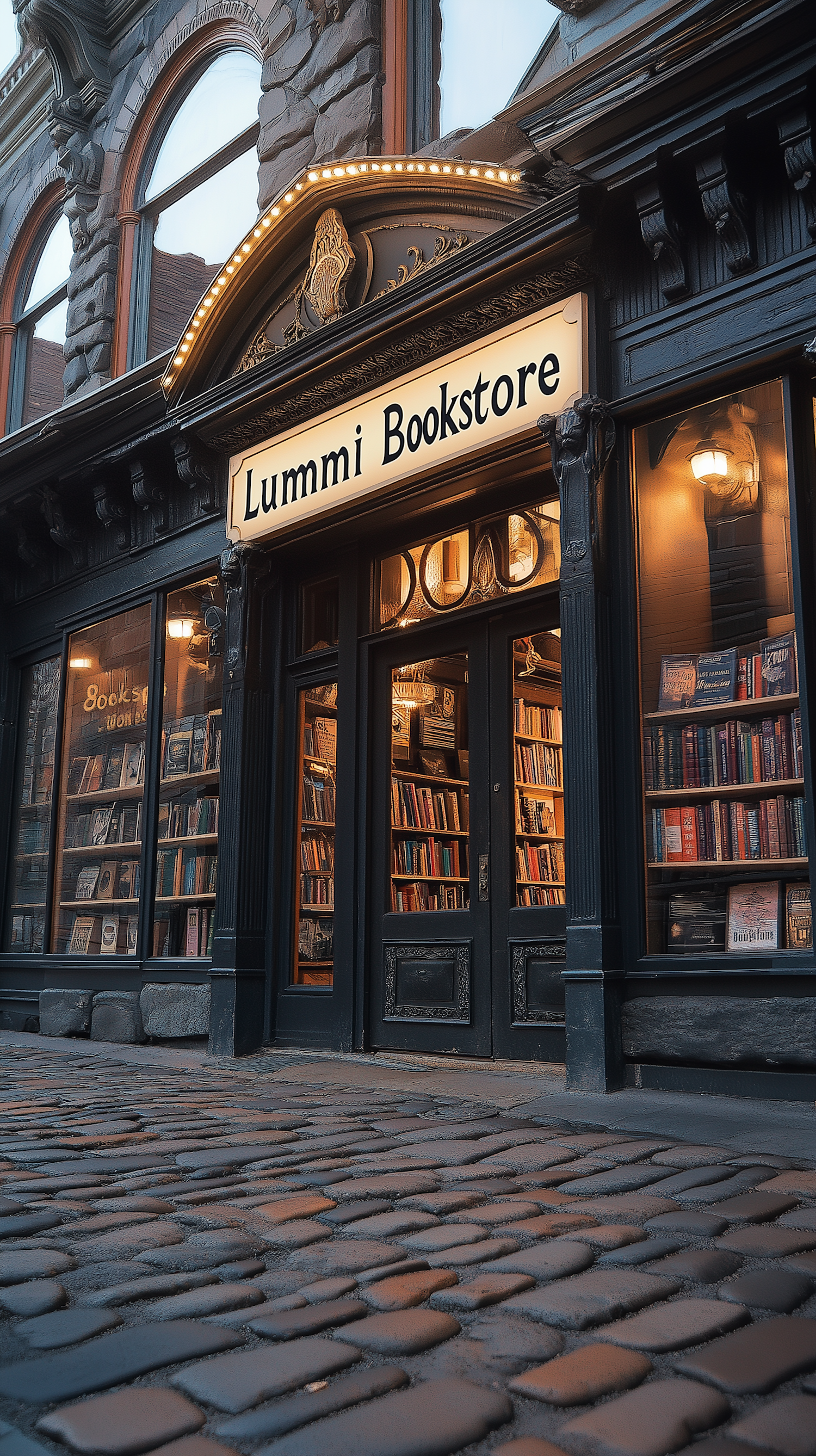 Charming vintage bookstore with ornate facade and cobblestone street, inviting with warm lights and rows of books in large windows.