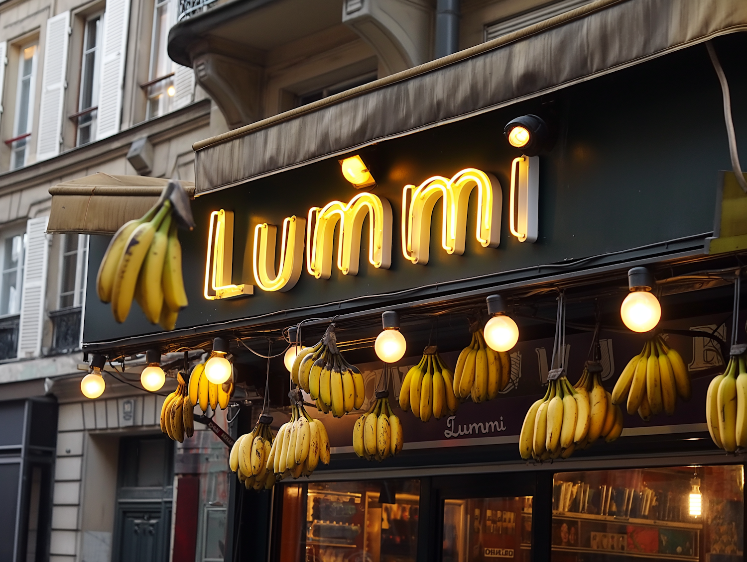 Charming storefront with a neon 'Lummi' sign and hanging bananas, set against a classic urban building facade.