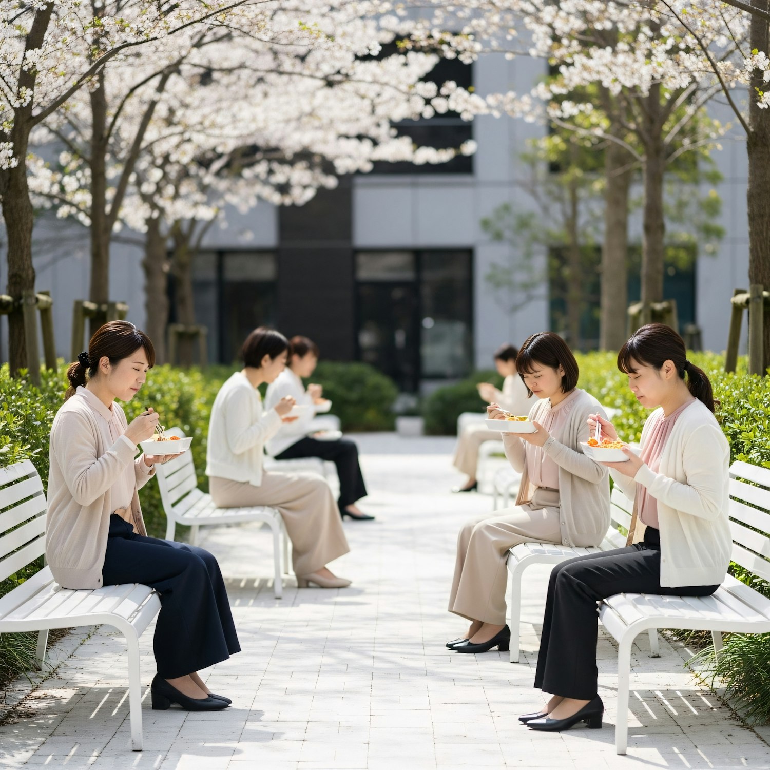 Women enjoying lunch on benches under cherry blossoms in a serene park setting, with a modern building in the background.