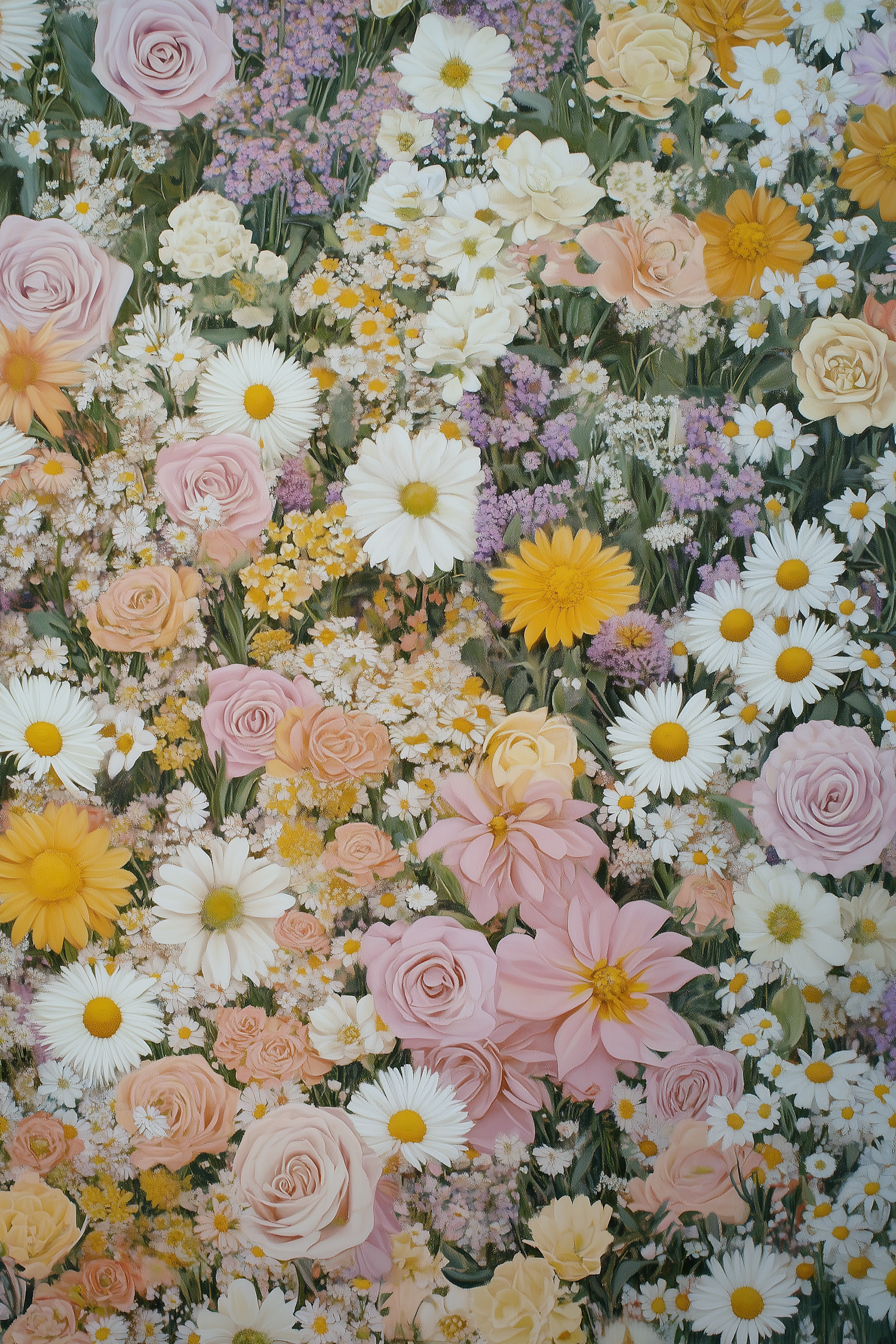 A lush floral arrangement with pink roses, white daisies, and yellow blooms, creating a vibrant tapestry of colors and textures.