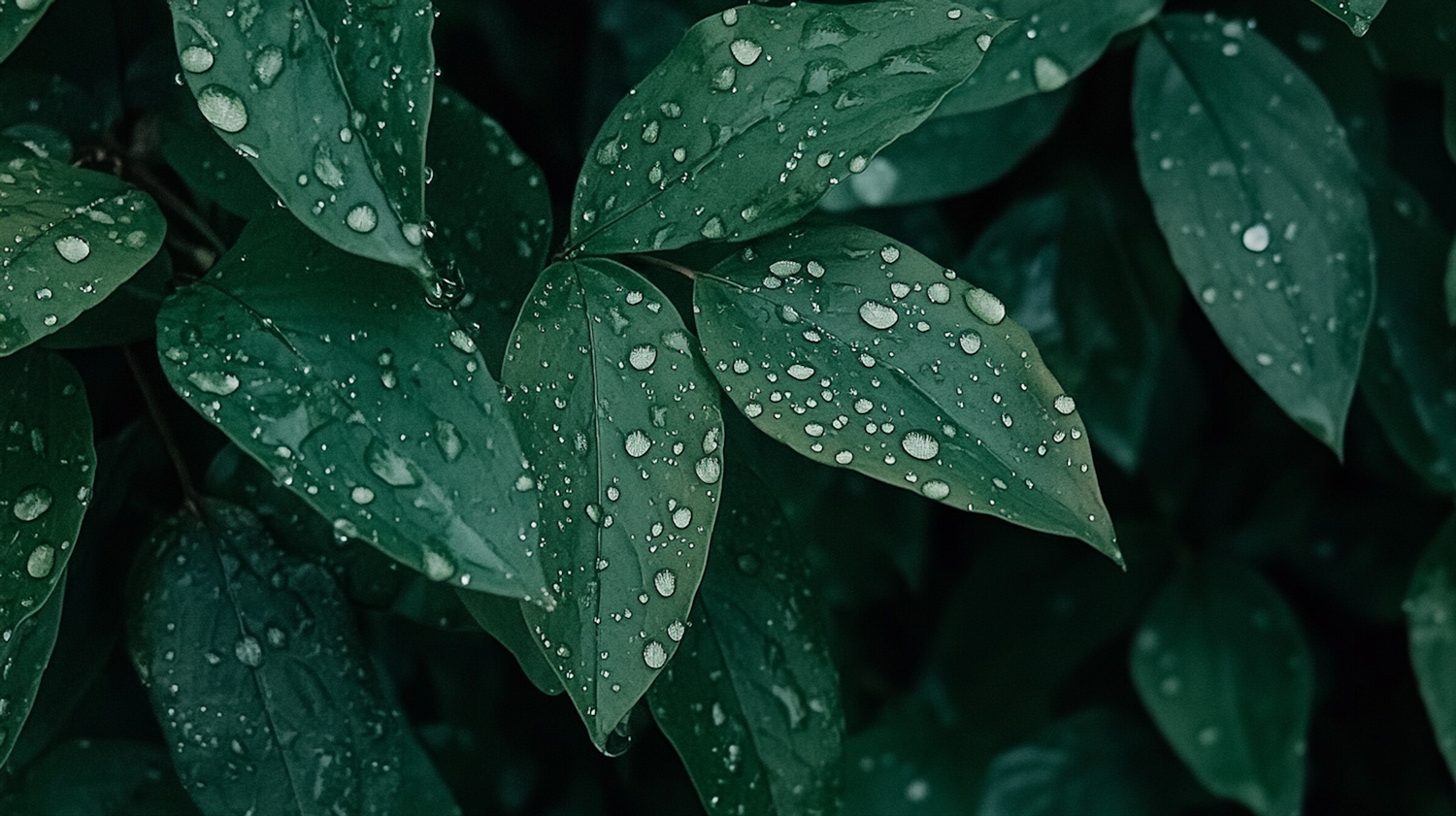 Vibrant green leaves adorned with sparkling water droplets, creating a fresh and serene natural scene.