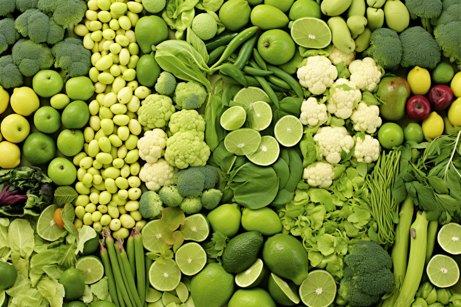A vibrant collection of green fruits and vegetables, including broccoli, limes, and apples, arranged in a lush, fresh pattern.