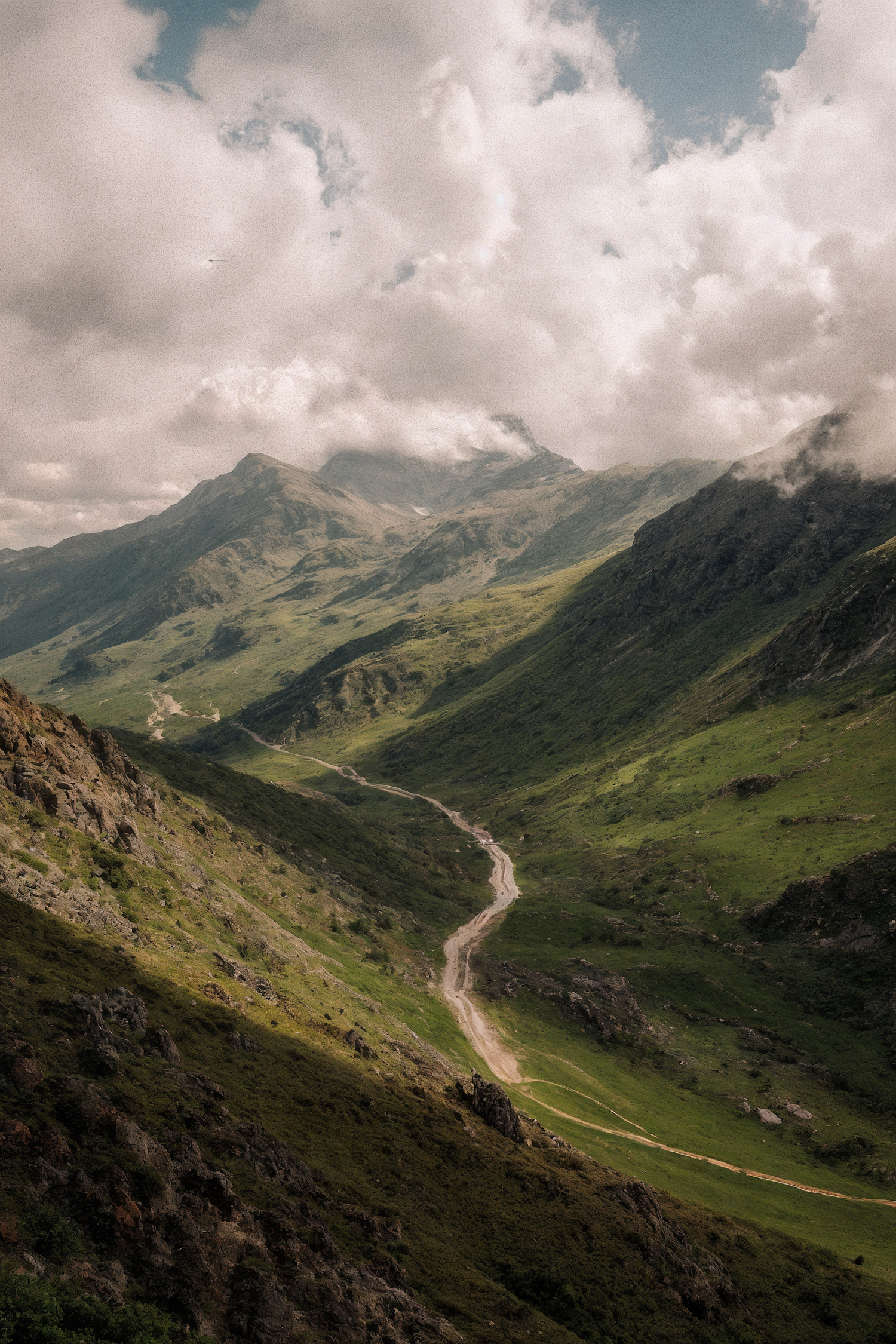 A picturesque mountain valley with a winding dirt path, lush greenery, and misty peaks under a partly cloudy sky.