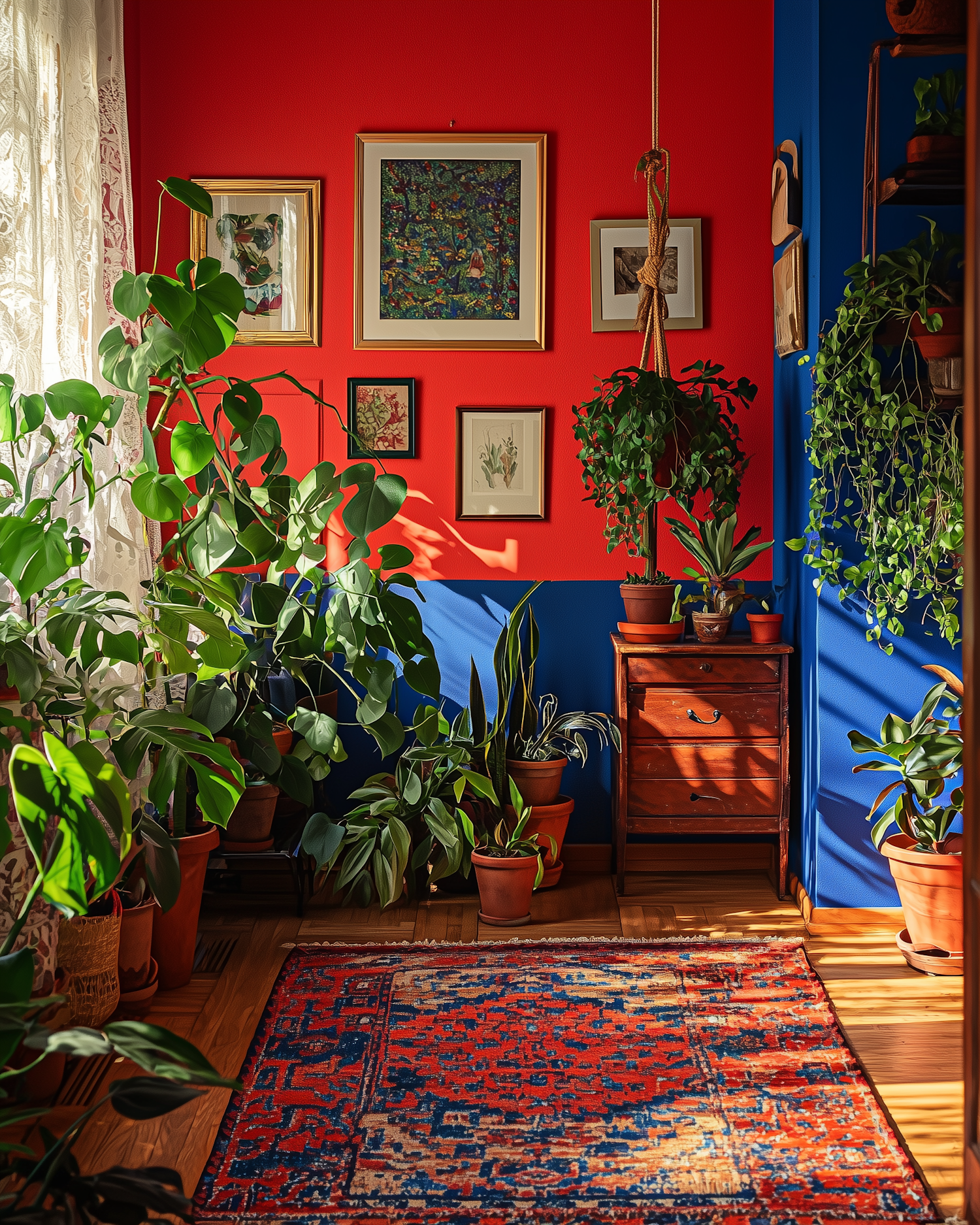 Bright room with lush plants, red and blue walls, botanical art, and a Persian-style rug. Sunlight enhances the cozy, natural vibe.