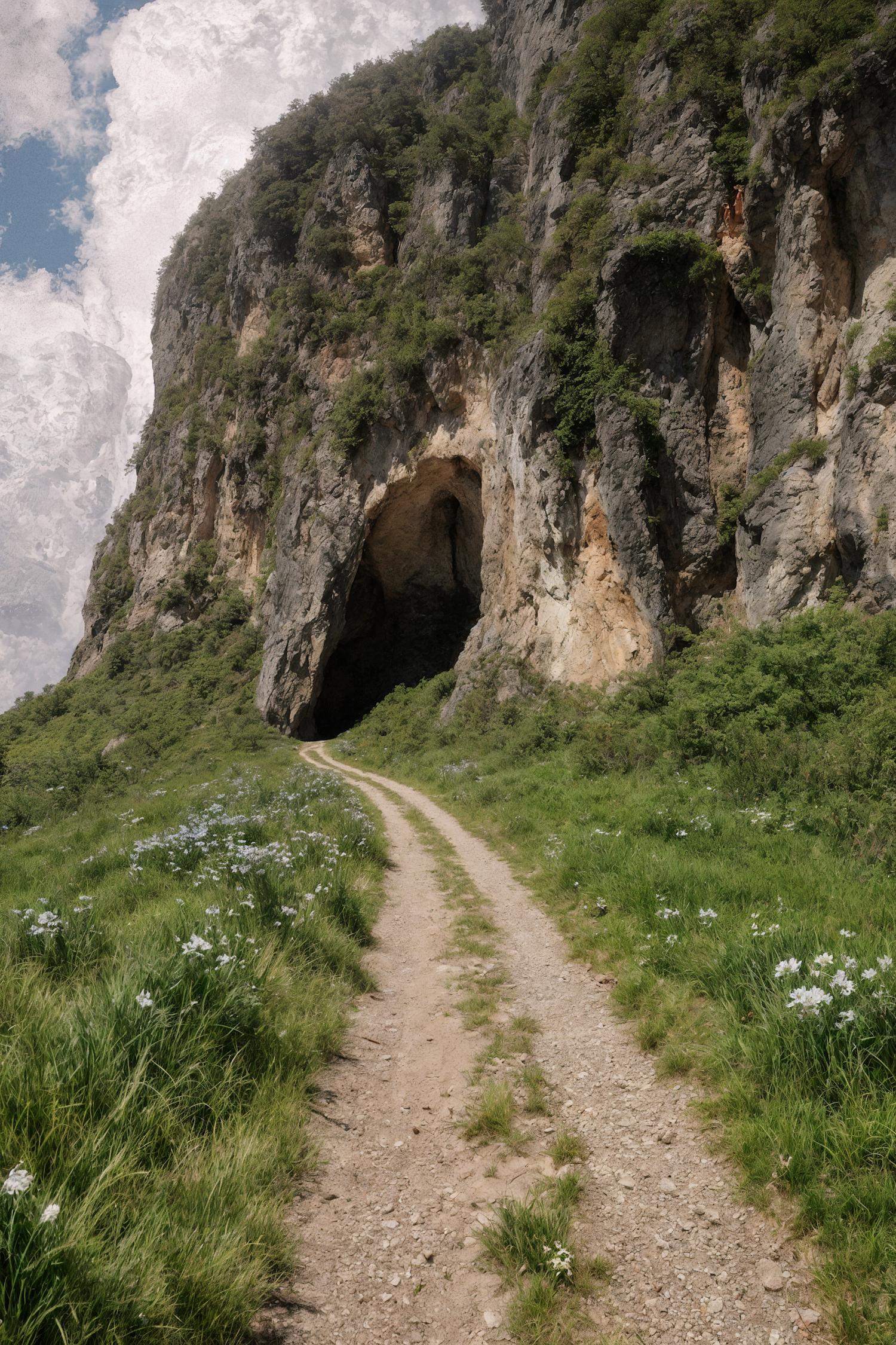 A scenic dirt path leads to a cave in a rocky cliff, surrounded by greenery and wildflowers under a partly cloudy sky.