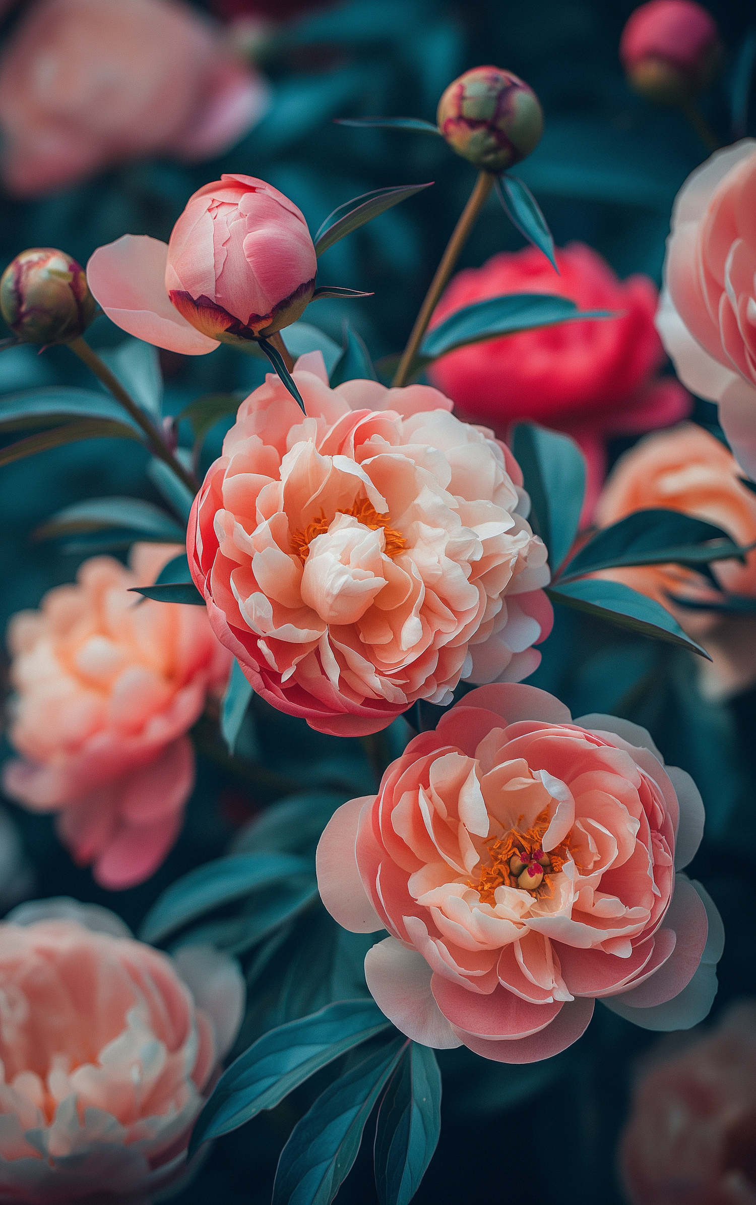 Vibrant pink and coral peonies in full bloom with lush green leaves, creating a fresh and natural floral scene.