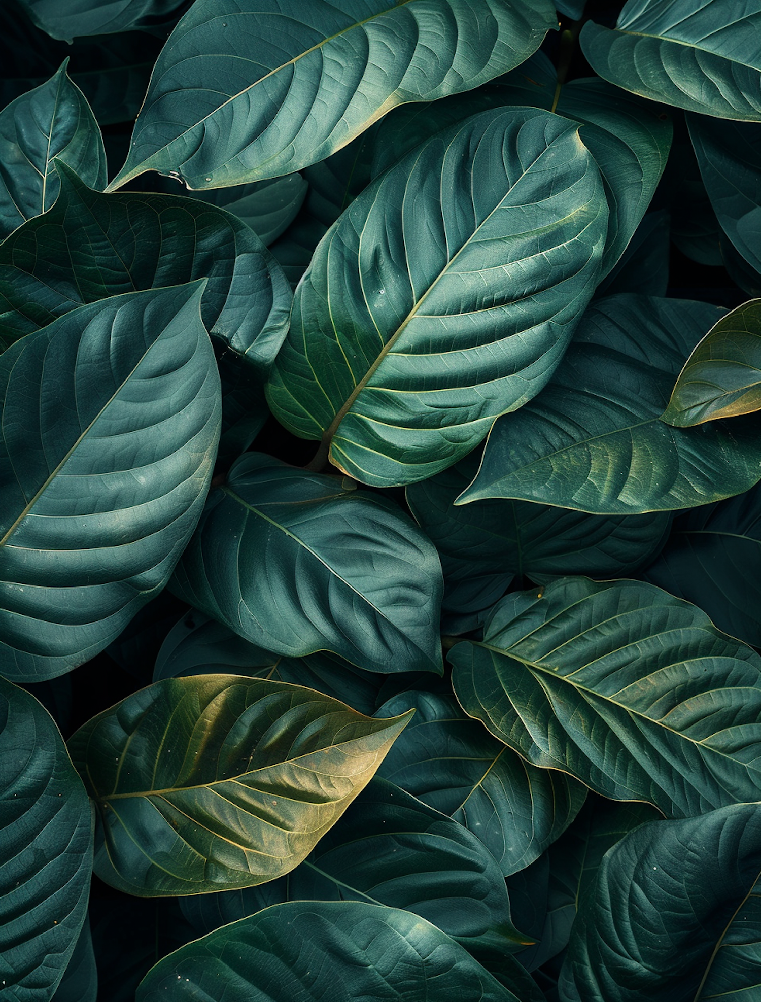 Vibrant green leaves with prominent veins create a lush, tropical pattern, highlighted by subtle hints of yellow and brown.