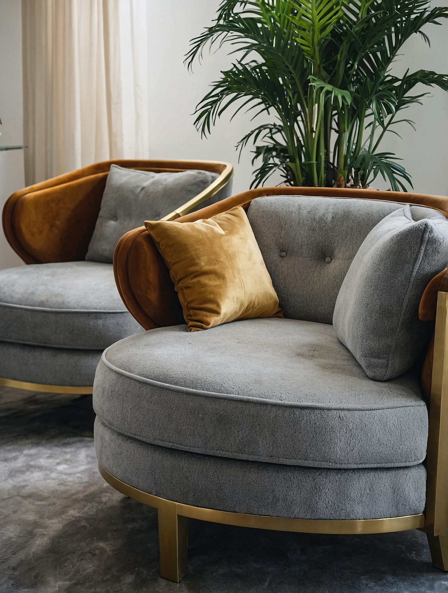 Elegant gray and gold armchairs with mustard cushions, set in a cozy space with lush green plants and soft natural lighting.