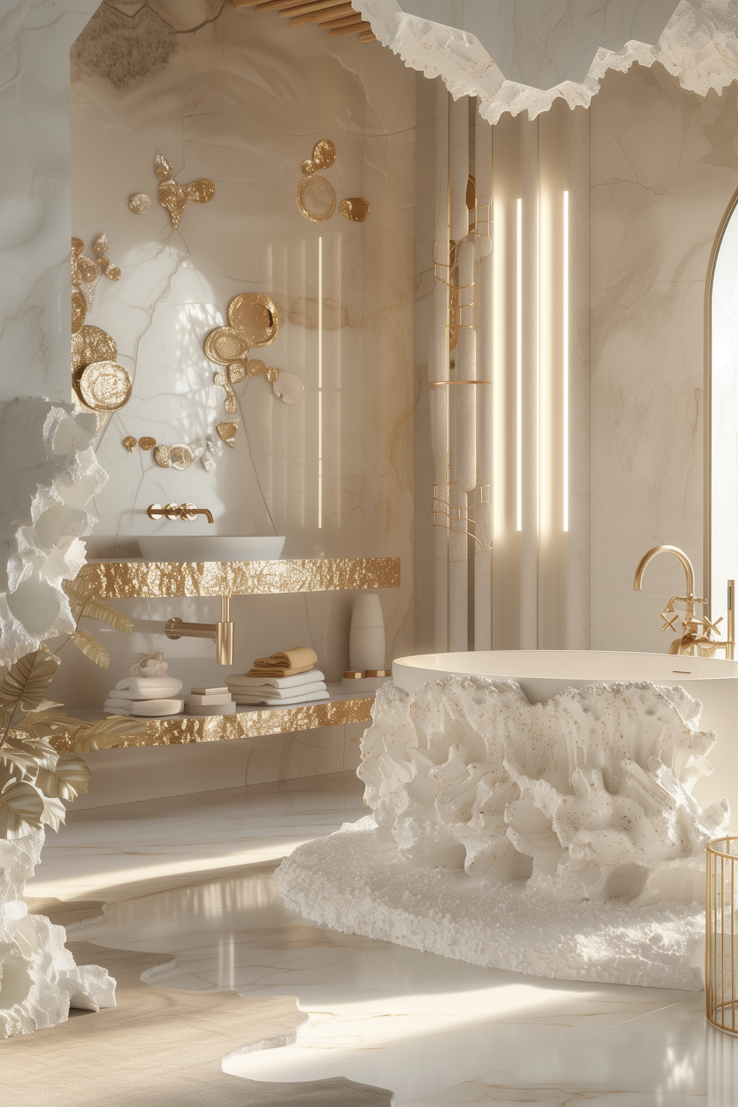 Luxurious bathroom with coral-like bathtub, gold accents, and ambient lighting. Elegant design with white and gold color palette.