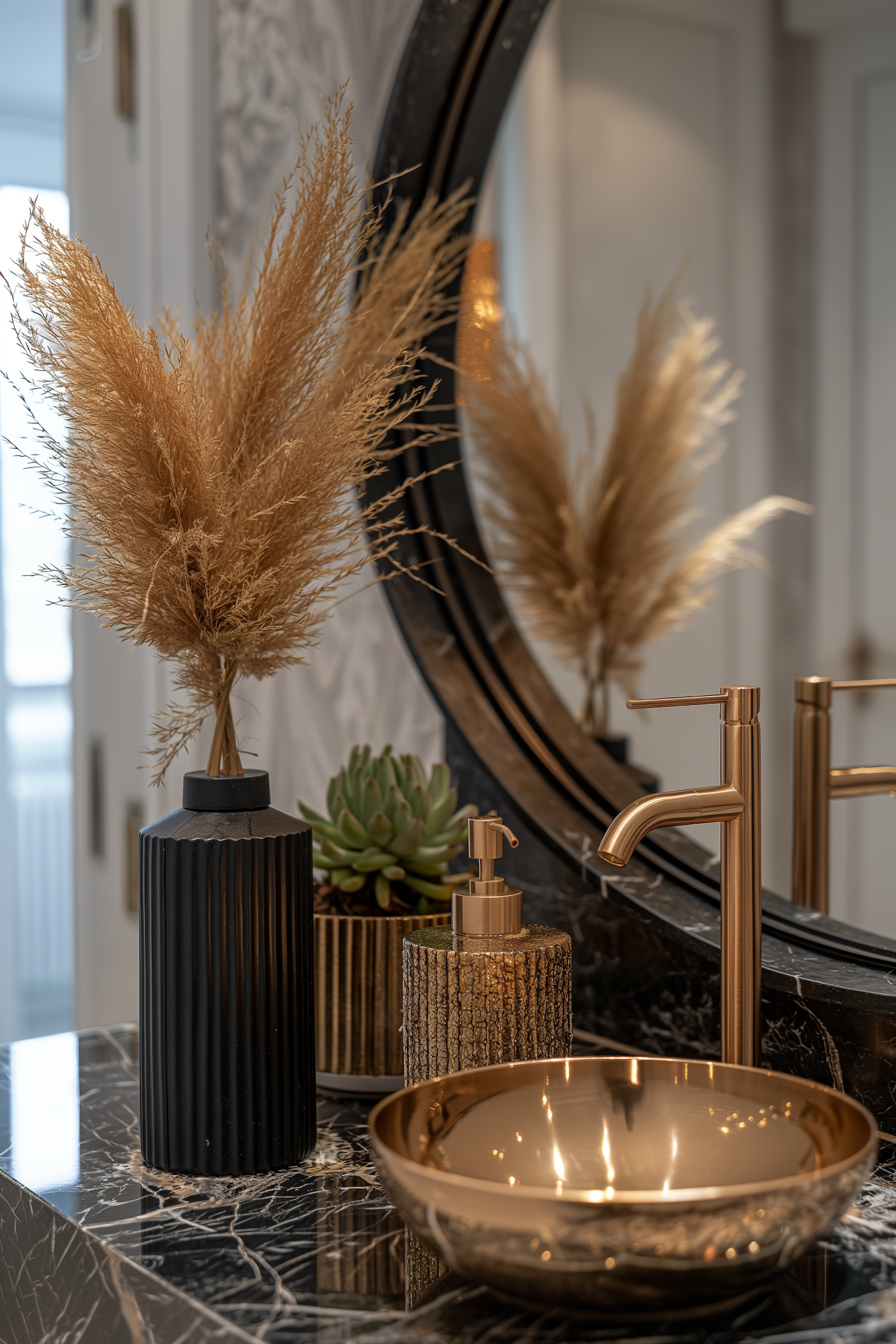 Luxurious bathroom decor with pampas grass, gold faucet, and marble countertop. Elegant and sophisticated design elements.
