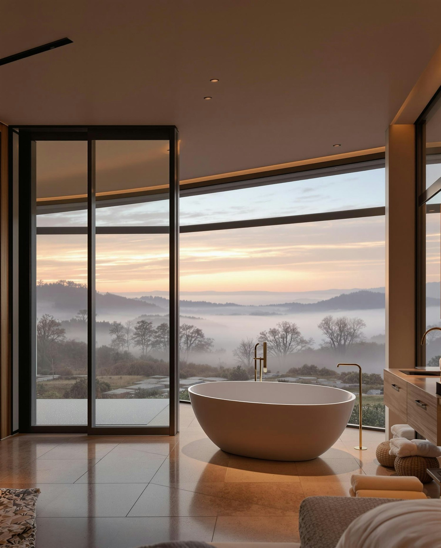 Modern bathroom with a freestanding tub, gold fixtures, and stunning floor-to-ceiling views of a misty sunrise over rolling hills.