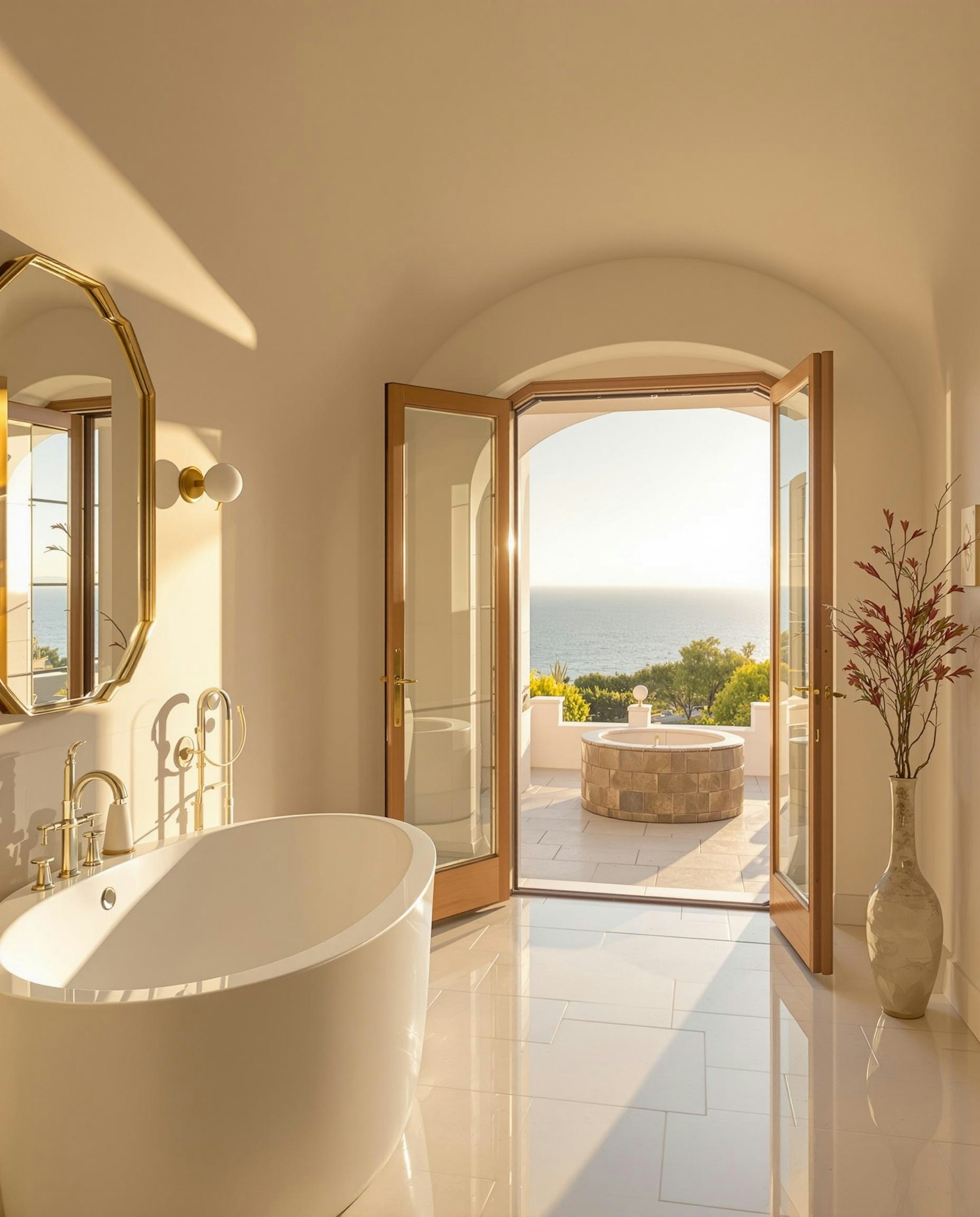 Elegant bathroom with a freestanding tub, gold accents, and ocean-view terrace featuring a stone hot tub. Perfect for relaxation.