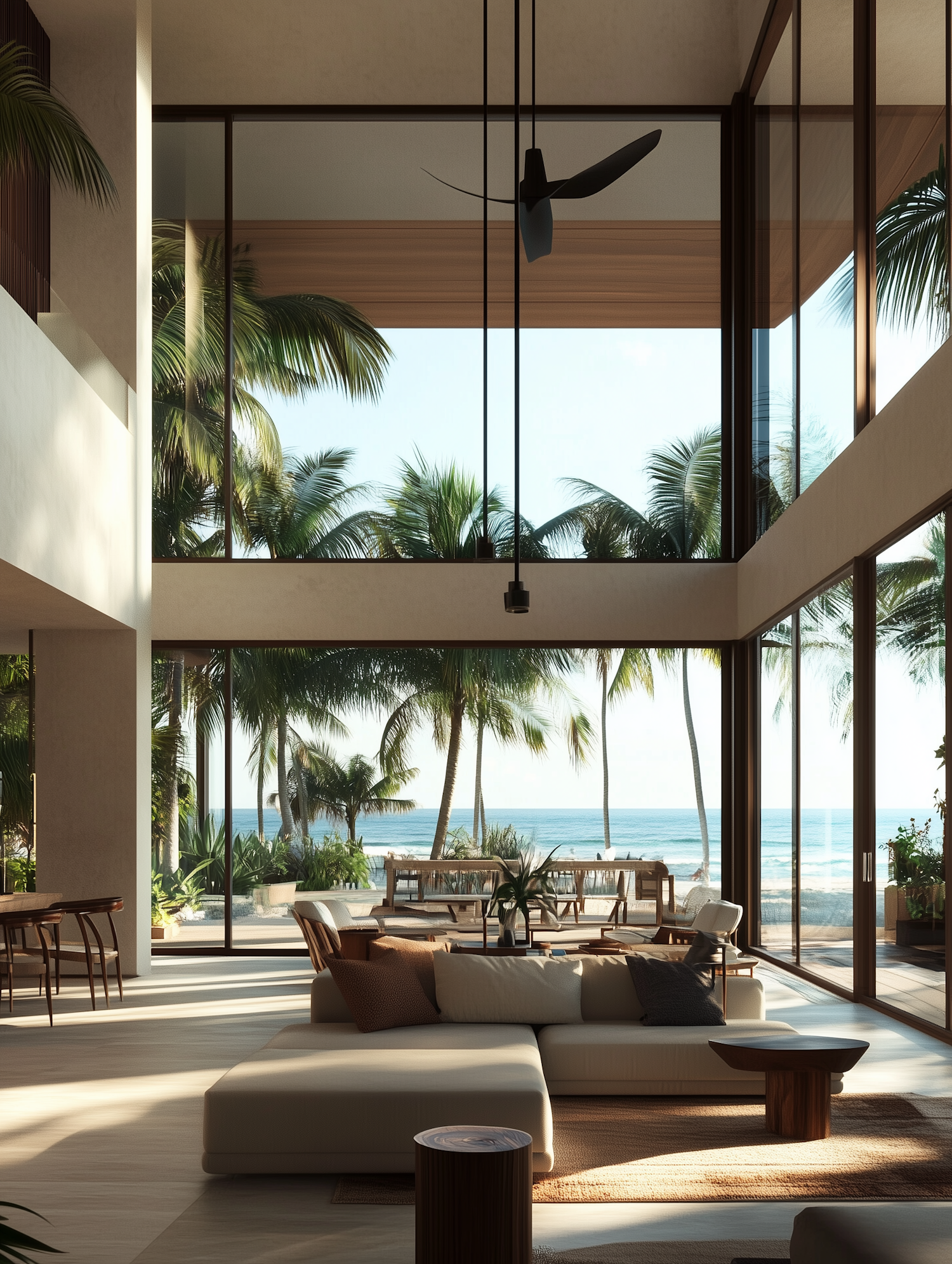 Modern beachfront living room with glass walls, tropical views, and minimalist decor. Perfect blend of luxury and nature.